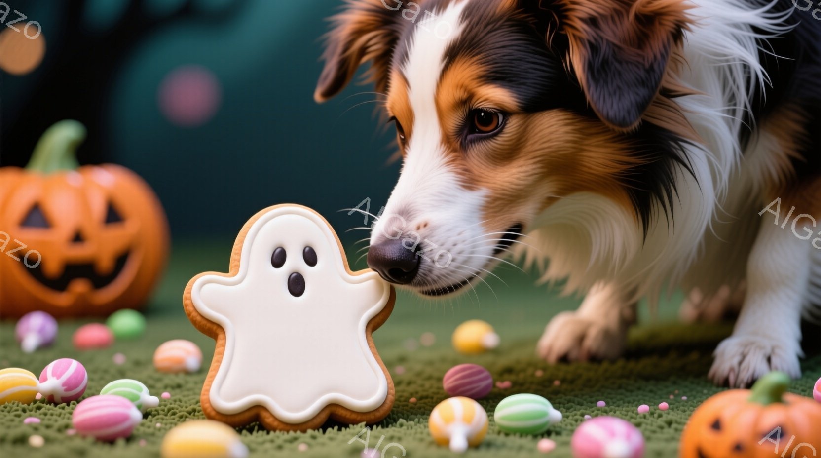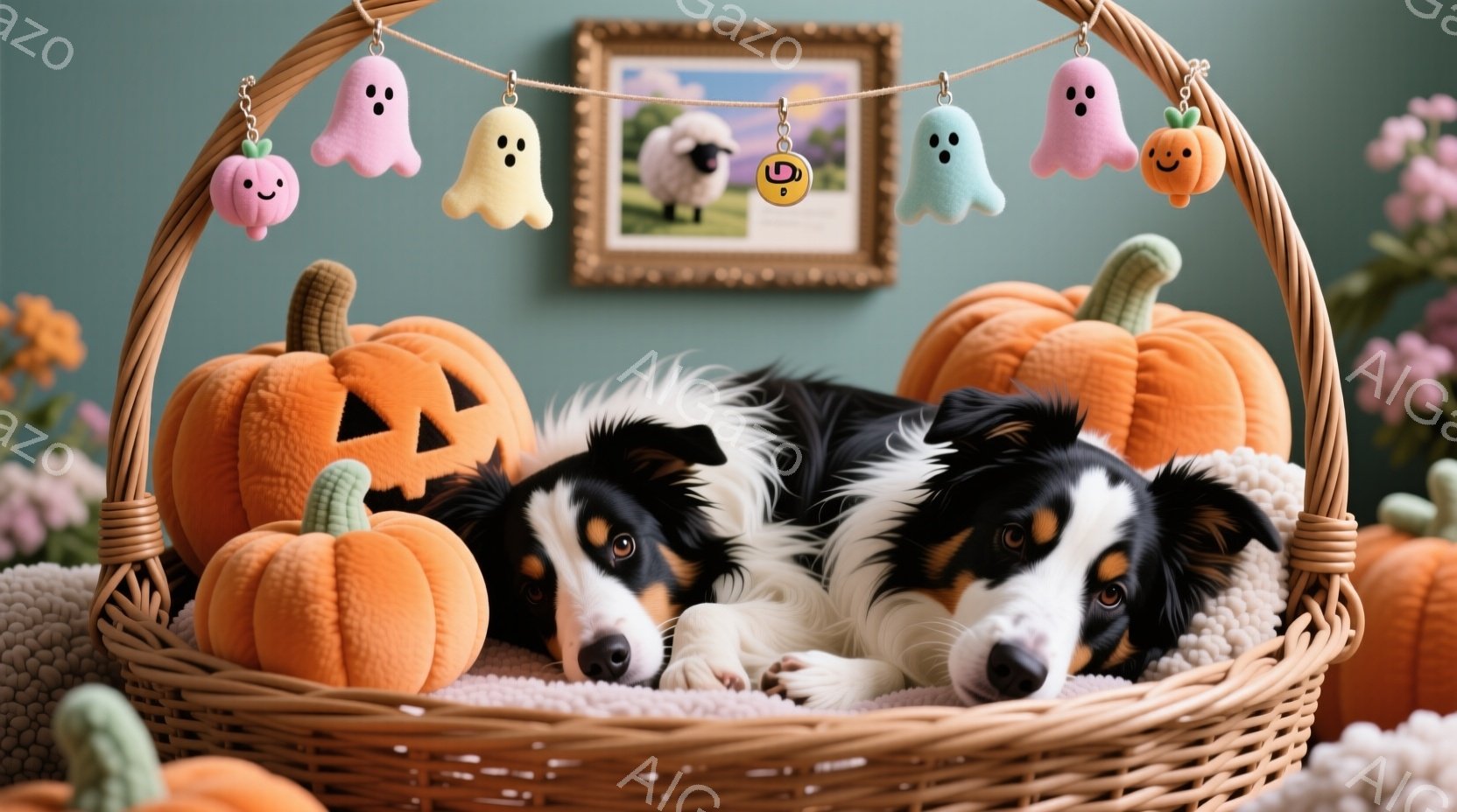 茶色と黒の毛並みのボーダーコリーが、籐製のバスケットの中に横たわっています。周囲にはオレンジ色のカボチャのぬいぐるみや、白い羊のぬいぐるみ、明るい色のクッションが置かれ、背景の壁にはハロウィーンの飾りと風景画が飾られています。全体的に、暖かく、可愛らしい秋の雰囲気が漂っています。