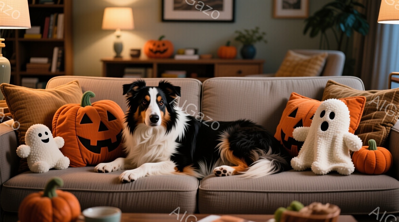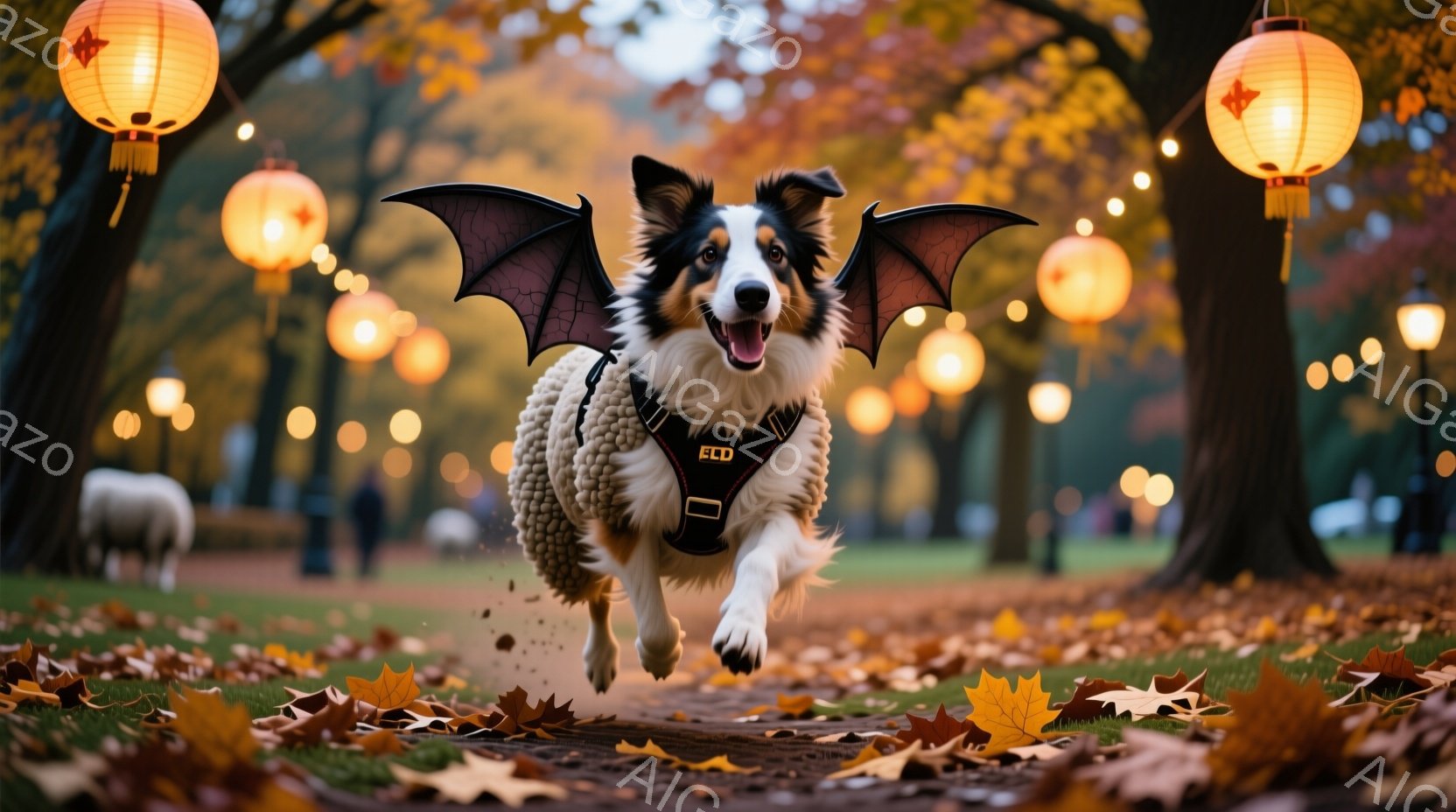 黒と白のボーダーコリーが、まるで空を飛ぶかのように、公園の遊歩道を走り抜けている。背中にはコウモリの羽が取り付けられており、楽しそうな表情で口を開けている。背景には、紅葉した木々と、ぼんやりと光る提灯が並び、秋の暖かい雰囲気を感じさせる。
