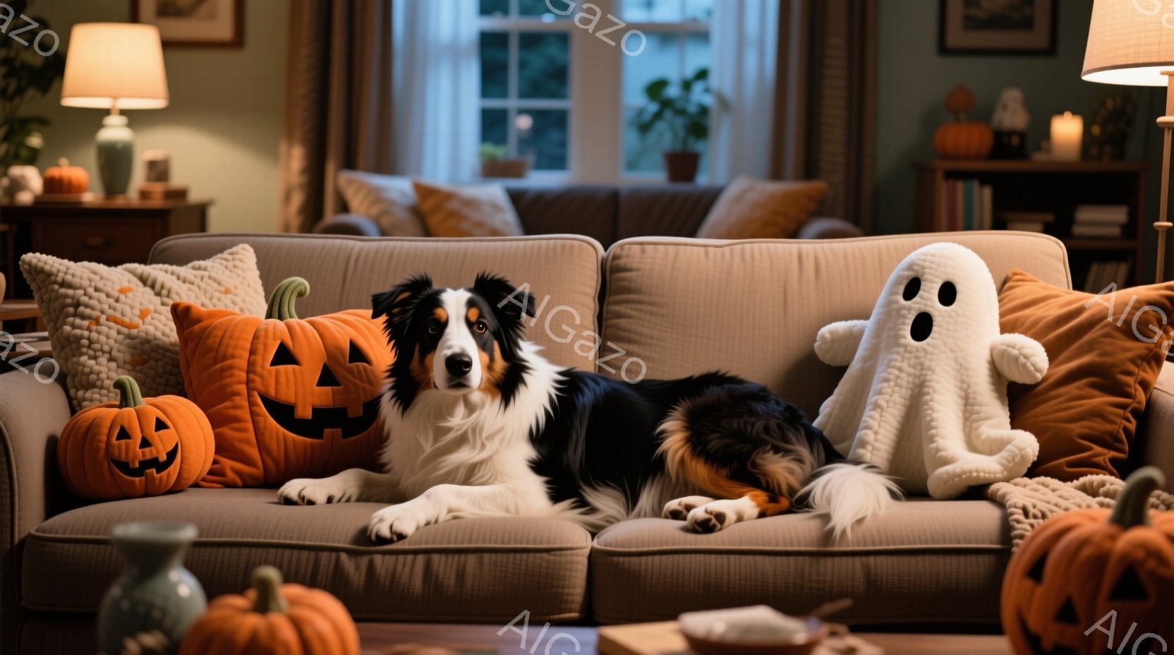 ハロウィーンをテーマにしたリビングルームの様子で、ソファーに様々な大きさのジャック・オー・ランタンのクッションやぬいぐるみ、そして可愛らしいテディベアが並べられています。背景にはハロウィーンの装飾が施された壁があり、部屋全体が暖色系の照明で照らされ、お祝いムードに包まれています。テーブルの上には、お菓子や小さなカボチャが置かれ、心地よくて楽しい雰囲気が漂っています。