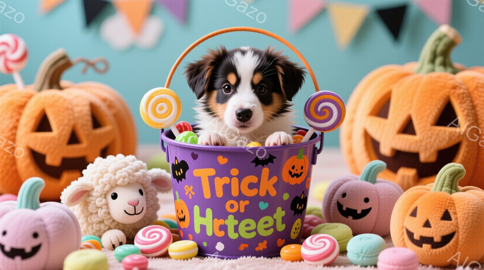 ハローウィーンをテーマにした可愛らしい写真です。茶色と黒の毛並みの小さな子犬が、オレンジ色の「Trick or Treat!」と書かれたバケツの中に座っており、周りにはキャンディーやハロウィーンの飾り付けのカボチャ、羊のぬいぐるみなどが散りばめられています。全体的に明るく、楽しげな雰囲気が漂っています。