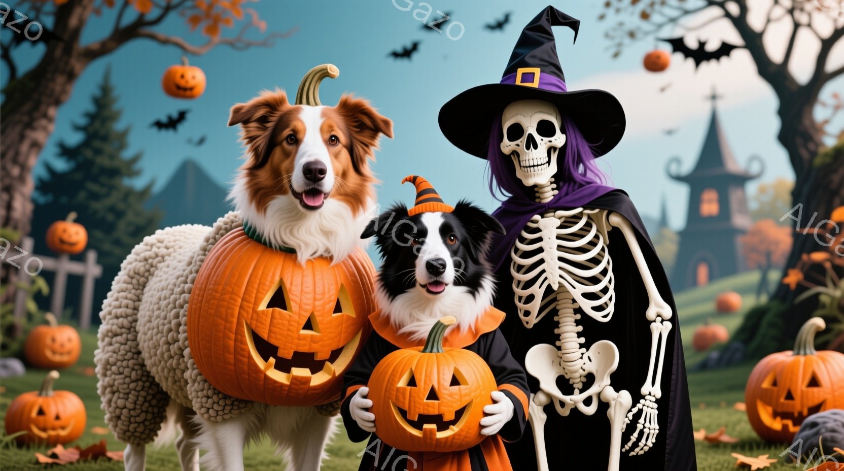 3匹の犬がハロウィーンの衣装を着て、彫刻されたカボチャに囲まれて立っています。黒い犬はカボチャの頭が入った衣装を着て、白い犬は羊の着ぐるみ、そしてもう一匹の黒い犬は骸骨の衣装に黒い帽子を被っています。背景には秋の木々と、遠くに見える建物があり、夕暮れのような暖かく穏やかな雰囲気です。