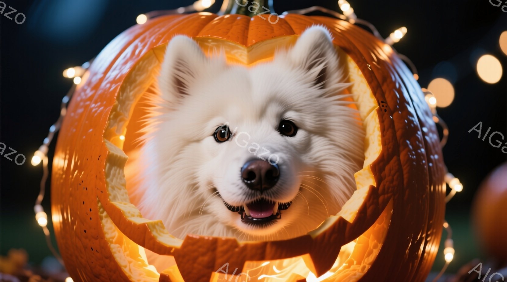 白い毛並みの犬が、くり抜かれたオレンジ色のカボチャの中に顔を出しています。犬は口を開けて笑顔を見せ、楽しそうな表情をしています。背景には、ぼやけたオレンジ色のカボチャと、温かい光を放つ電飾が散りばめられており、ハロウィーンの楽しい雰囲気を醸し出しています。