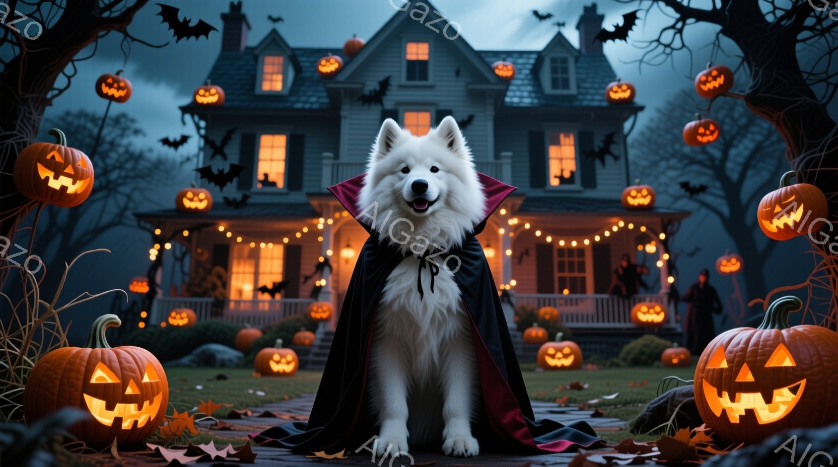白い毛並みの大型犬が、黒いマントと赤い襟付きの衣装を身に着けて正面を向いています。背景には、ジャック・オー・ランタンで飾られた古風な邸宅と、暗い夜空に舞うコウモリが見え、ハロウィーンの雰囲気です。犬は落ち着いて立っており、どこか誇らしげな表情をしています。