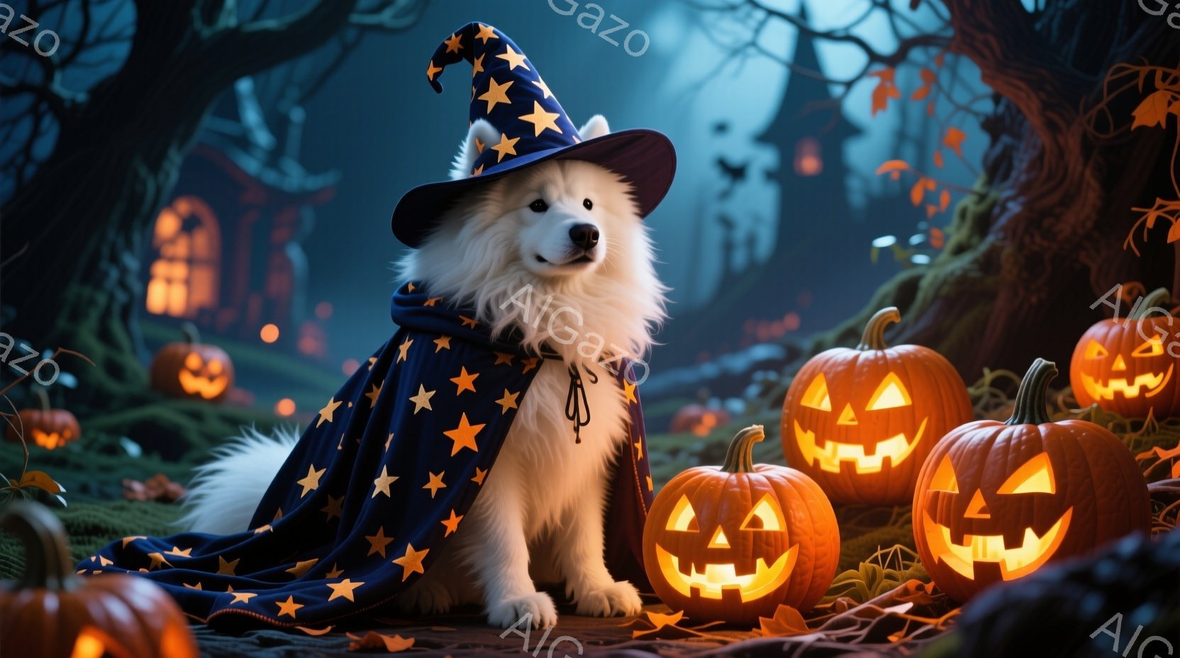 白い毛並みの犬が、星柄の青い魔法使いのローブと帽子を身につけて座っています。周りにはジャック・オー・ランタンが三つ並び、不気味で幻想的な雰囲気を作り出しています。背景は暗い森で、遠くにはぼんやりと建物が見え、ハロウィーンの夜を思わせる薄暗い光が灯っています。