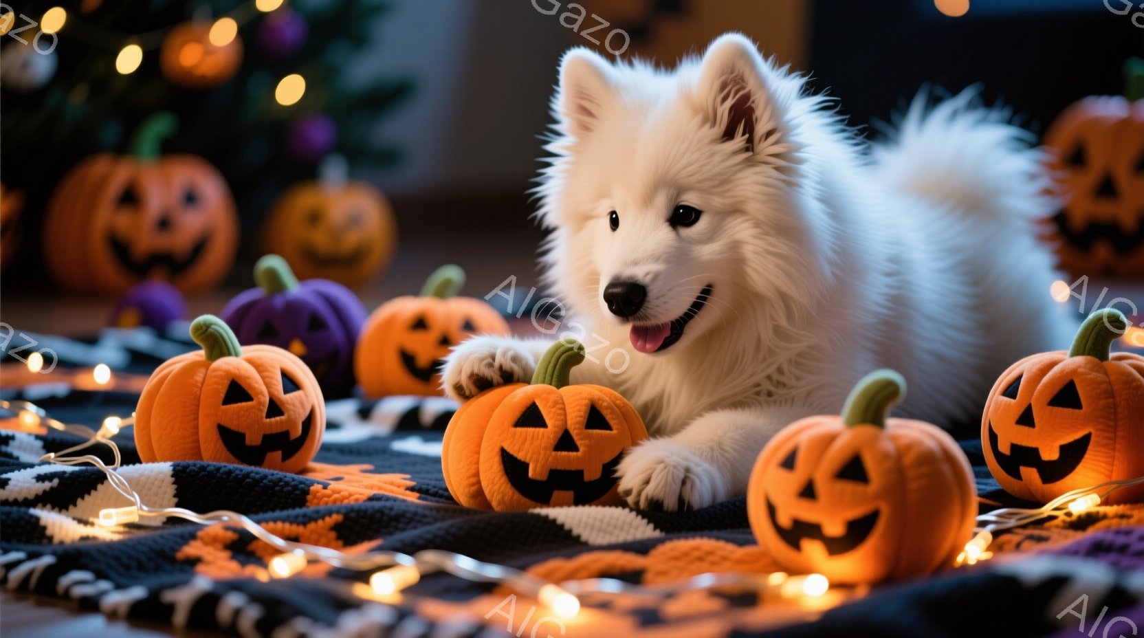 白い毛並みの犬が、ハロウィーンのカップケーキが並んだケーキスタンドの前に座っています。カップケーキにはお化けやコーンキャンディの飾りがあり、背景にはハロウィーンの装飾が施された棚と、ジャック・オー・ランタンが並んでいます。全体的に明るく、お祝いムードにあふれた、可愛らしいハロウィーンの雰囲気です。