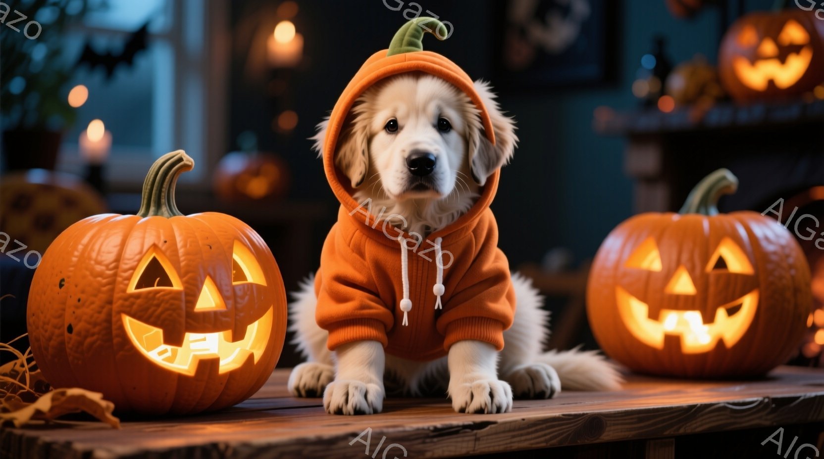 鮮やかなオレンジ色のハロウィン風パーカーを着た子犬が、彫刻が施されたジャック・オ・ランタンに挟まれて木製のテーブルに座っています。子犬は前足を伸ばし、少し上目遣いで穏やかな表情をしています。背景には、ぼんやりと見える他のジャック・オ・ランタンと暗い部屋があり、全体的に暖かくお祝いムードの漂うハロウィーンの光景です。