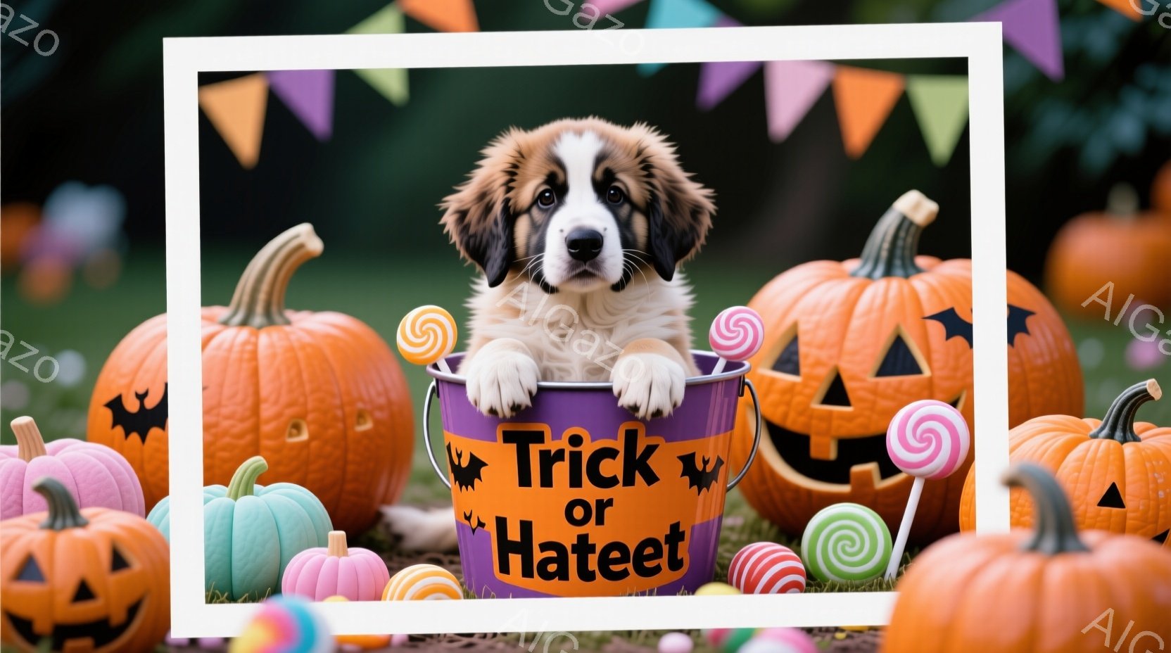 この無料AI生成画像「白い毛並みの大型犬が、ハロウィーンをテーマにしたオレンジ色のカボチャのクッションとぬいぐるみのお化けに囲まれて、灰色のソファにゆったりと横たわっています。犬はリラックスした表情で、前足には黒い肉球が見えます。背景には、ハロウィーンの装飾が施された暖色系の部屋が広がっており、温かく心地よい雰囲気を醸し出しています。」は、2025年10月24日に作成されました。 サイズは 1664×928px の高解像度で、商用利用も可能なフリー素材として提供しています。