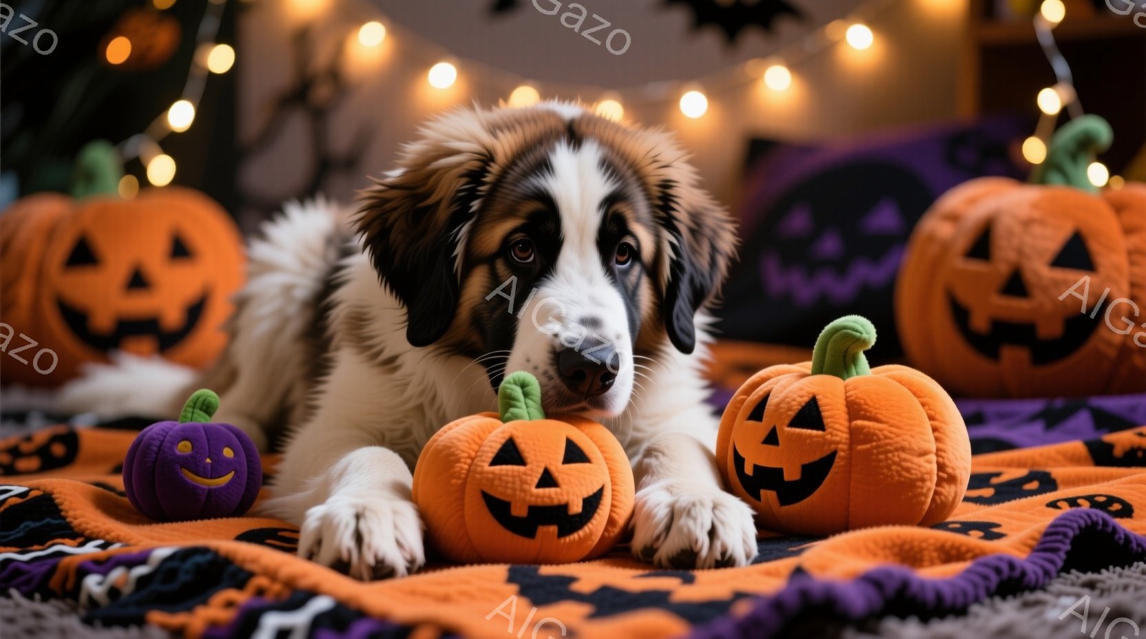 長い毛並みのクリーム色の犬が、ハロウィーンのオレンジ色のカボチャの置物と紫色の毛布の上に横たわっています。犬はリラックスした表情で、まるでカボチャを守っているかのようです。背景には、点灯したオレンジ色のライトと、さらに多くのハロウィーンの装飾が見え、温かくお祝いムードに包まれています。