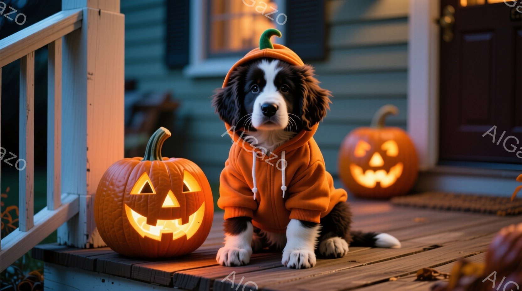 暖炉の光が灯る玄関先に、ハロウィーンの衣装を着た犬が座っている。オレンジ色のパーカーのような衣装は可愛らしく、犬の表情は穏やかで、まるでハロウィーンを楽しんでいるようだ。背景には、様々な大きさのジャック・オ・ランタンが置かれ、落ち葉が散らばるウッドデッキが秋の訪れを感じさせる。