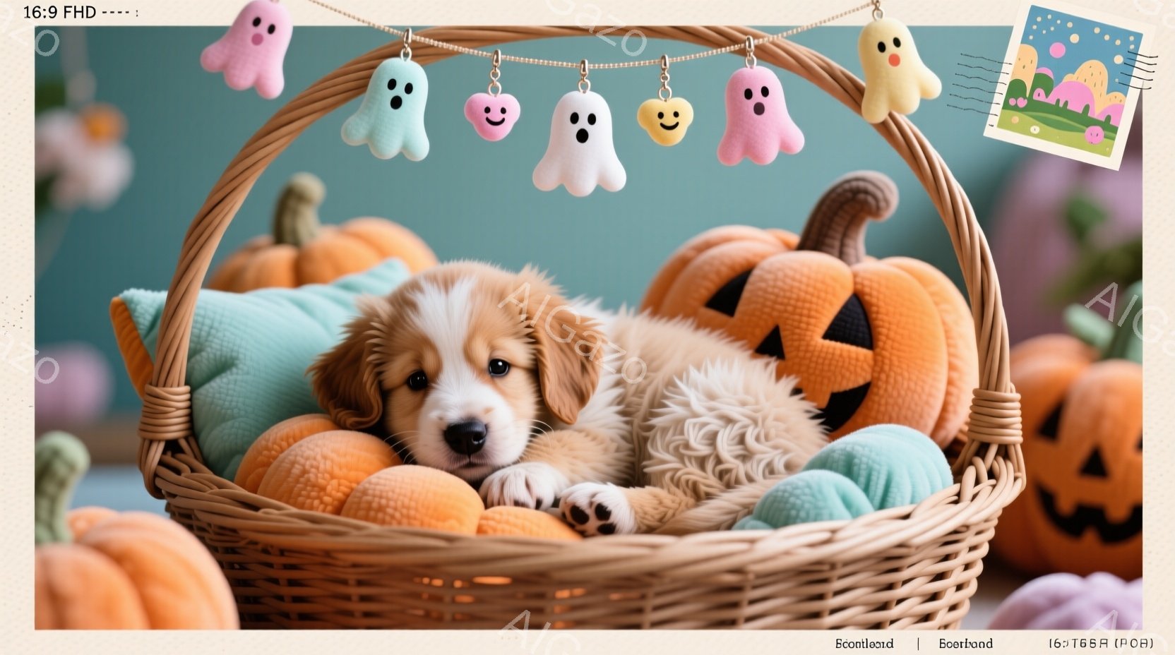 籠の中にふわふわとした毛並みのパピーが丸まって眠っています。オレンジと薄緑色のカボチャが籠の周りに置かれ、上には可愛らしいお化けのガーランドが飾られています。全体的に暖かく、秋らしい雰囲気で、パピーの愛らしさが際立っています。