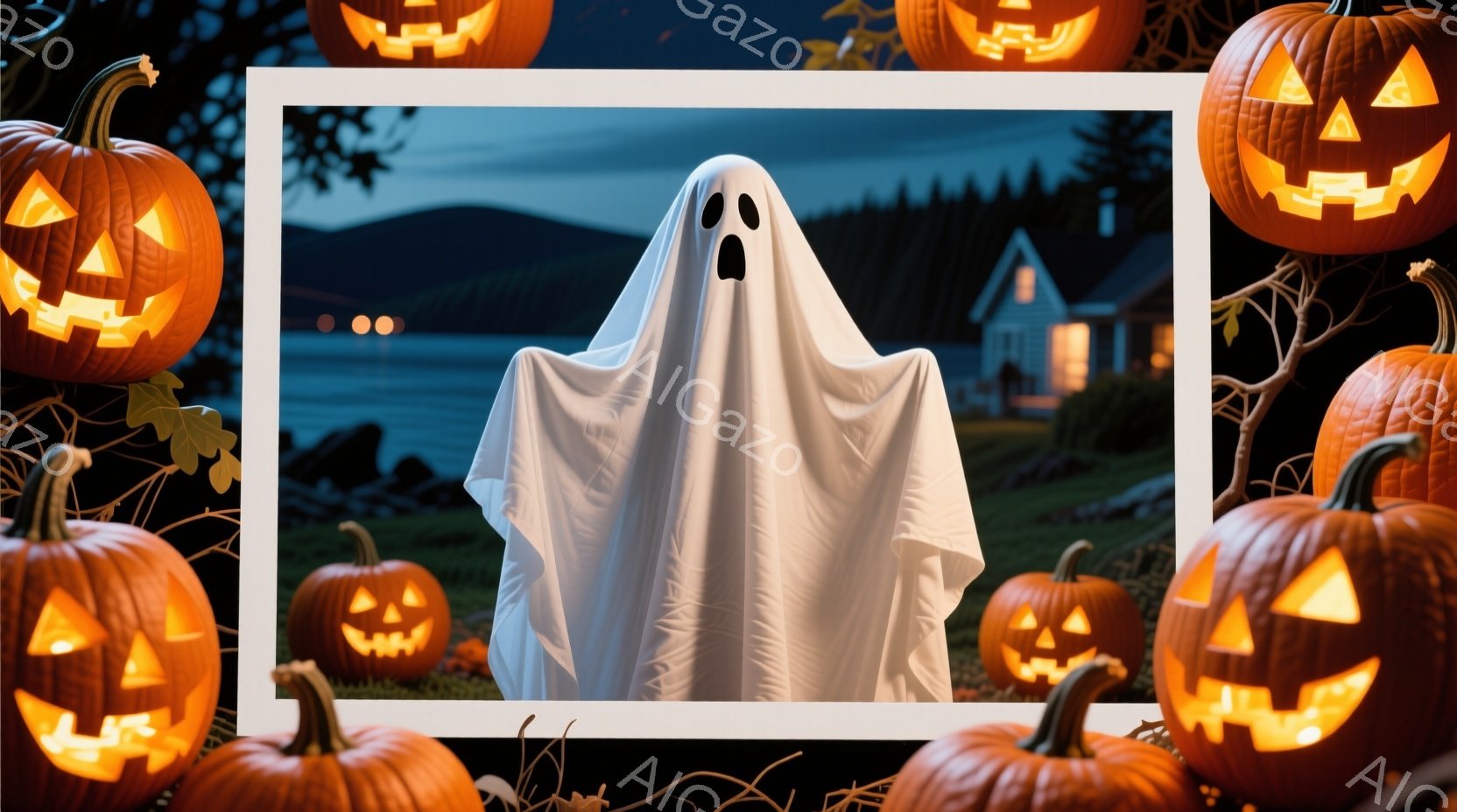 この無料AI生成画像「暖炉の木製のテーブルの上に、ハロウィーンの飾り物が並んでいます。オレンジ色のジャック・オ・ランタン、可愛らしい白いお化け2体、そして黒い猫の置物が、暖かく優しい光の中で佇んでいます。全体的に、秋の夜の温かく、お祝いのムードが漂っています。」は、2025年10月24日に作成されました。 サイズは 1664×928px の高解像度で、商用利用も可能なフリー素材として提供しています。