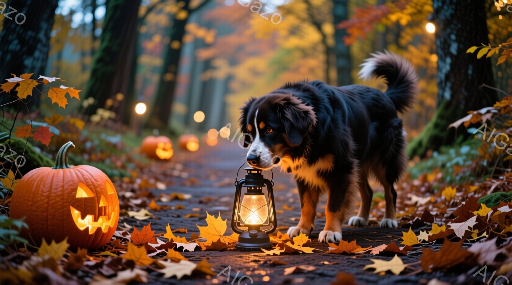 散り落ちた紅葉の敷き詰まった道に、くり抜かれたハロウィンのカボチャと灯りが灯ったランタンが置かれ、その横に毛並みの美しい黒と白のボーダーコリーが佇んでいます。犬は少し鼻を下げてランタンを覗き込むような姿勢で、好奇心旺盛な表情を浮かべています。背景には秋の森が広がり、ぼんやりとした光が差し込み、温かく幻想的な雰囲気を醸し出しています。