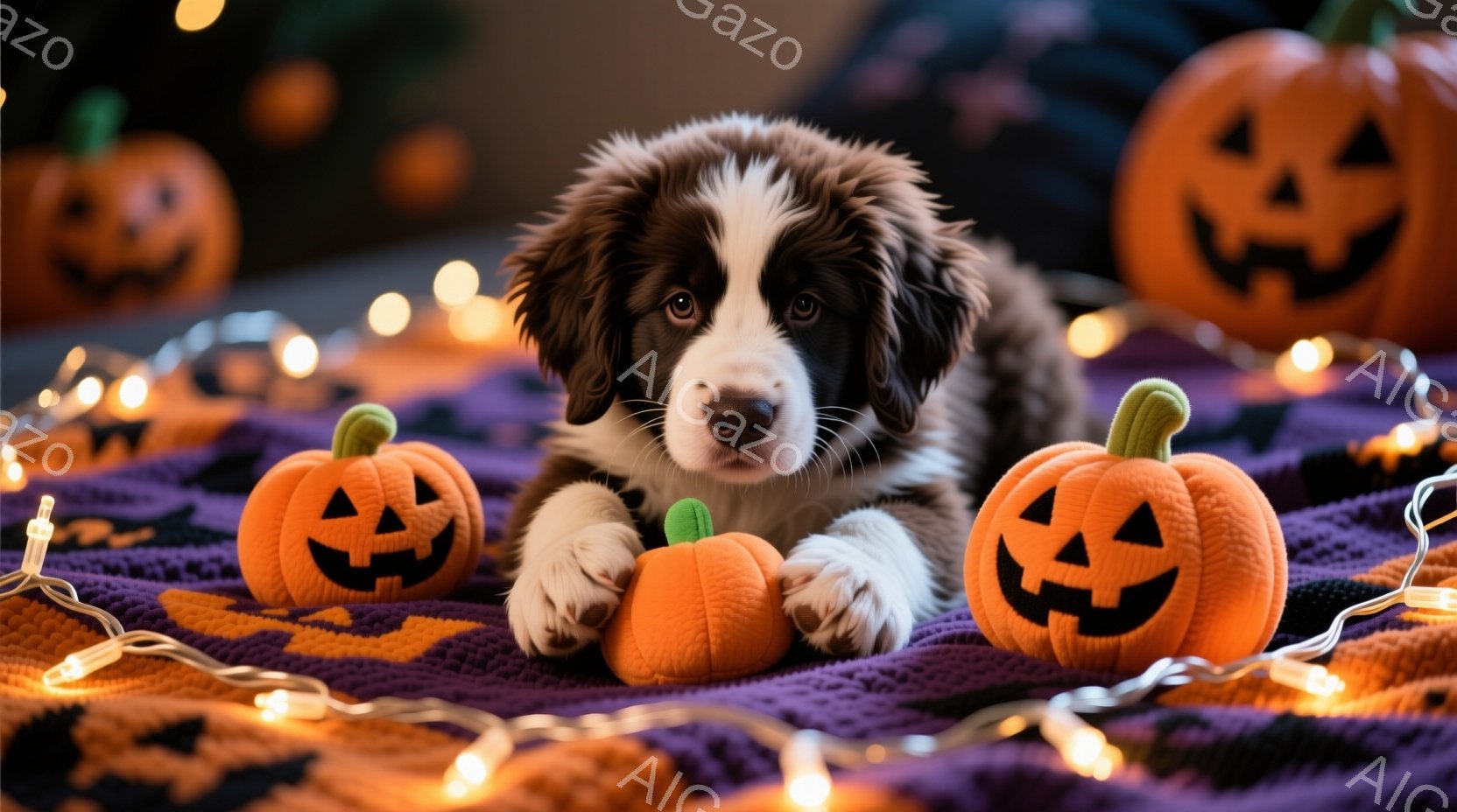 白と茶色の毛並みを持つ子犬が、ハロウィーンの装飾である小さなジャック・オー・ランタンに囲まれて横たわっています。子犬は少し口を開けていて、楽しそうな表情をしています。背景には、紫とオレンジの模様の布と、ぼんやりと光るハロウィーンライトがあり、温かくお祝いの雰囲気を醸し出しています。