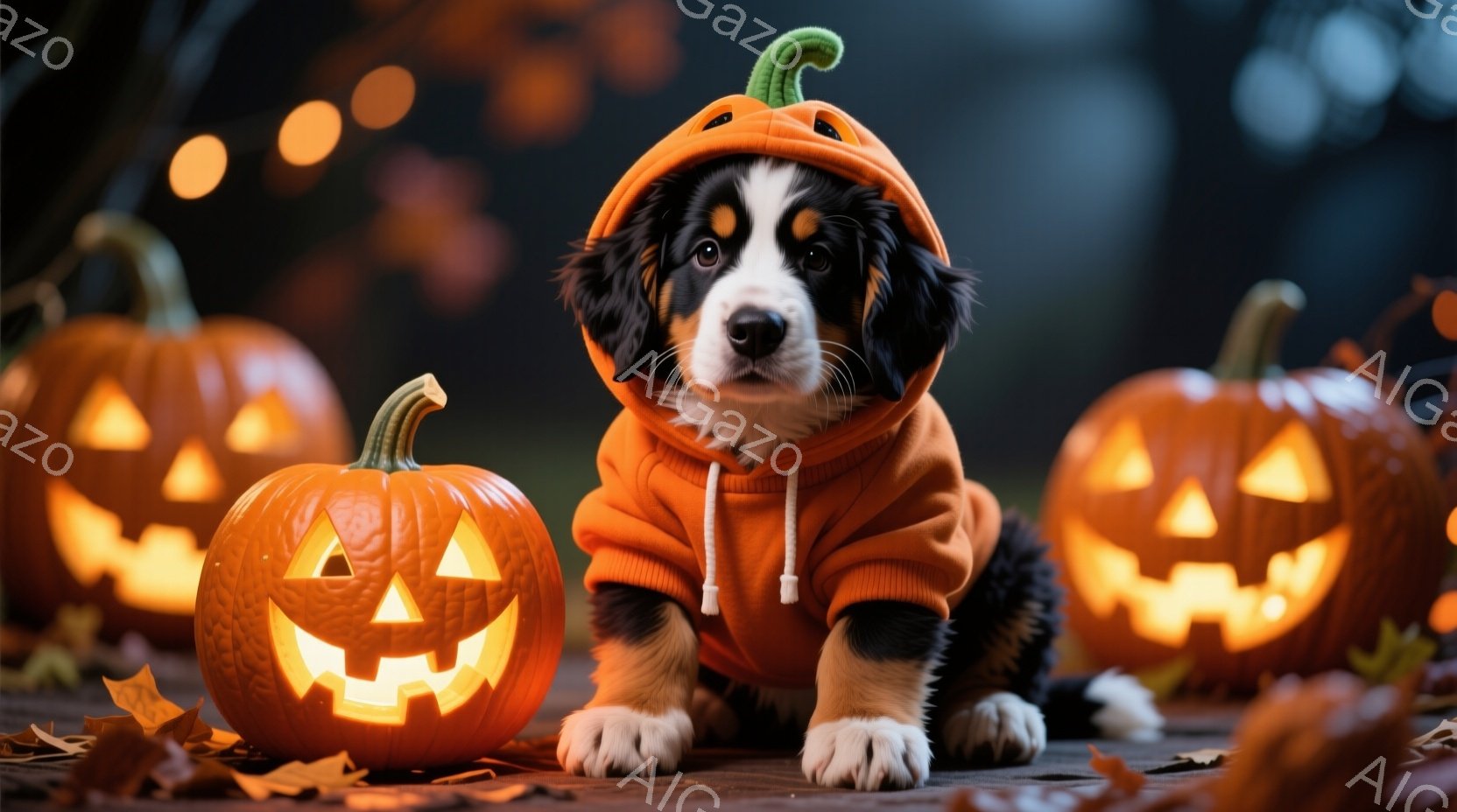 バーニーズ・マウンテン・ドッグが、ハロウィーンを連想させる背景の中で正面を見据えています。黒い魔女帽子を被り、いたずらっぽい表情で、まるでハロウィーンのパーティーに参加しているかのようです。背景には、お化けの形をした風船やポストカードが浮かび、明るくお祝いの雰囲気を醸し出しています。
