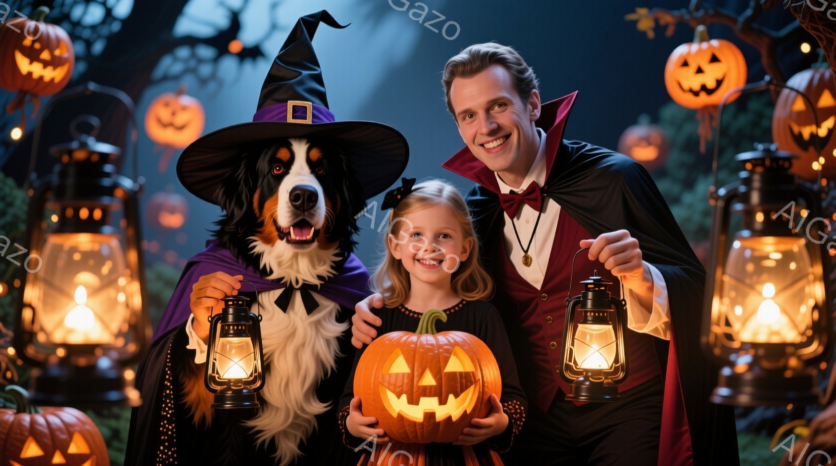 ハロウィーンをテーマにした家族写真です。男性は吸血鬼の衣装で、女性と犬はそれぞれ魔女と吸血鬼の帽子をかぶっています。背景には、オレンジ色のジャック・オー・ランタンやランタンが並び、少し不気味ですが楽しい雰囲気が漂っています。