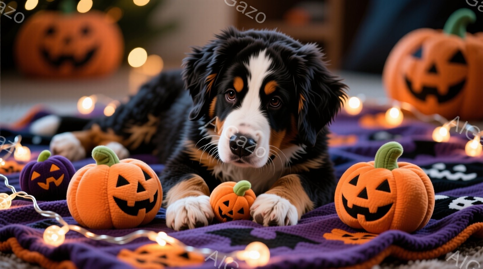 ハロウィーンをテーマにした画像で、大きな犬がカップケーキの山の上に立っています。犬は茶色と白の毛並みで、嬉しそうな表情をしています。背景にはオレンジ色のカボチャの飾りや紫色の旗、お化けの形の飾りが散りばめられ、お菓子が添えられています。