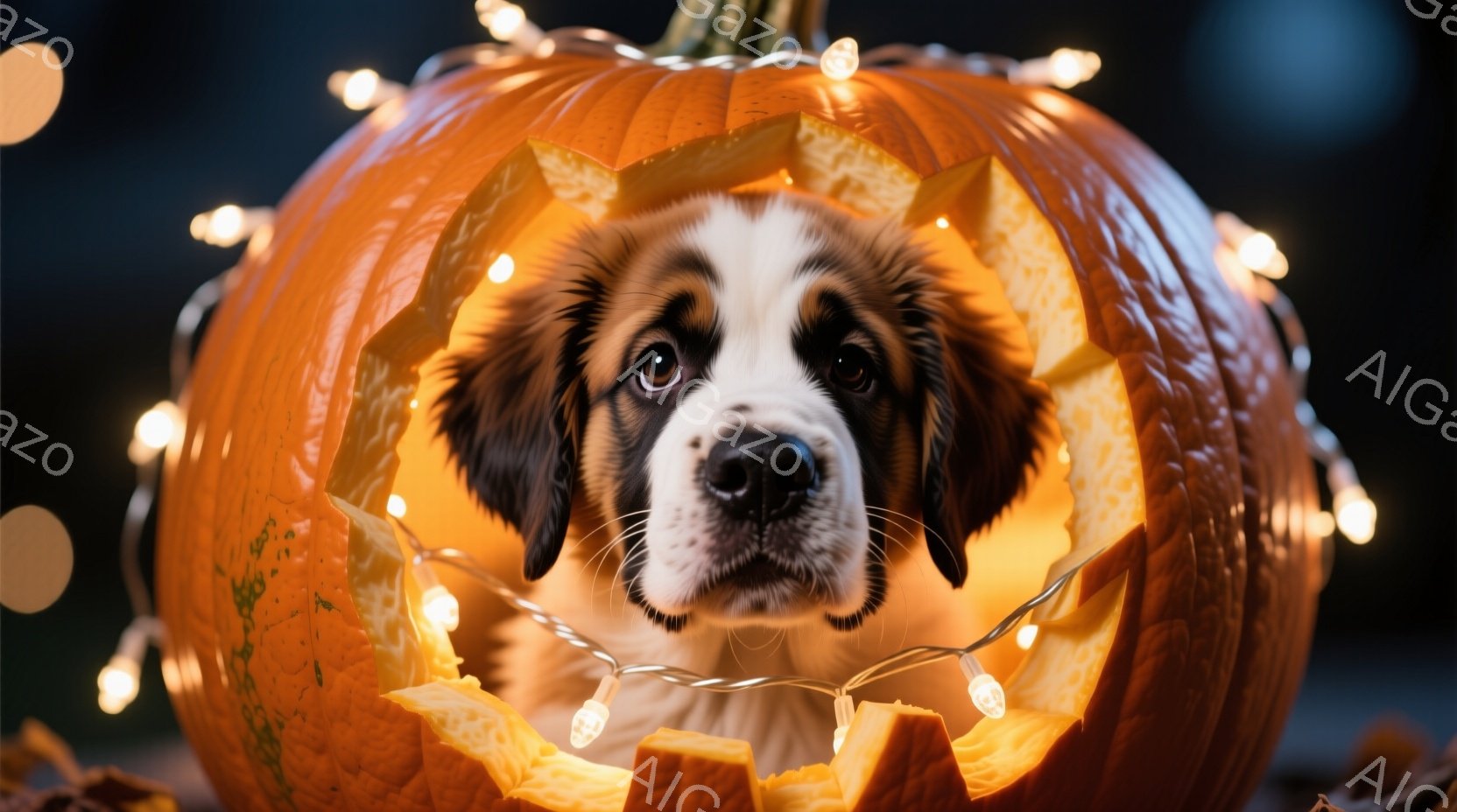 大きなオレンジ色のハロウィンカボチャの中に、毛並みの美しい子犬が顔を出しています。子犬は茶色と白の毛並みで、少し心配そうな表情をしています。背景にはぼんやりとした光のストリングライトがあり、ハロウィンの温かく楽しい雰囲気を醸し出しています。