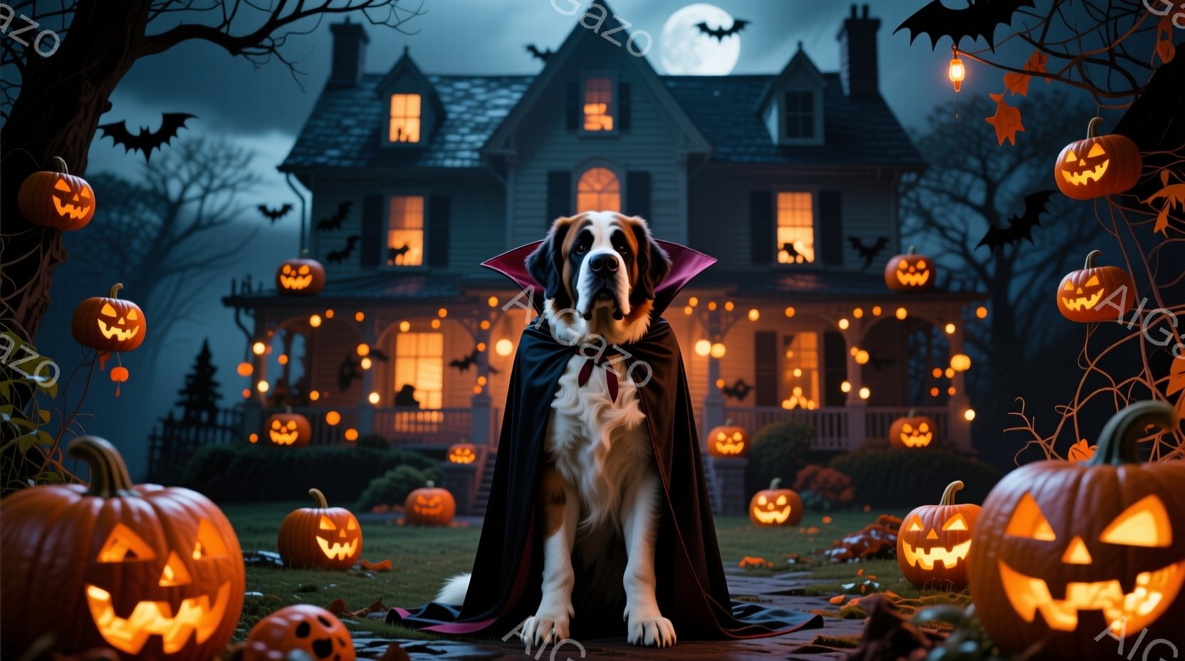この無料AI生成画像「2匹の大型犬がハロウィーンをテーマにしたオレンジ色の背景に横たわっており、それぞれ骸骨柄のコスチュームを着ています。犬たちはリラックスした表情で、おもちゃの骸骨を前足で抱えています。背景には、黒いバットやジャック・オー・ランタンのぬいぐるみなど、ハロウィーンの装飾が散りばめられており、全体的に陽気で可愛らしい雰囲気です。」は、2025年10月24日に作成されました。 サイズは 1664×928px の高解像度で、商用利用も可能なフリー素材として提供しています。
