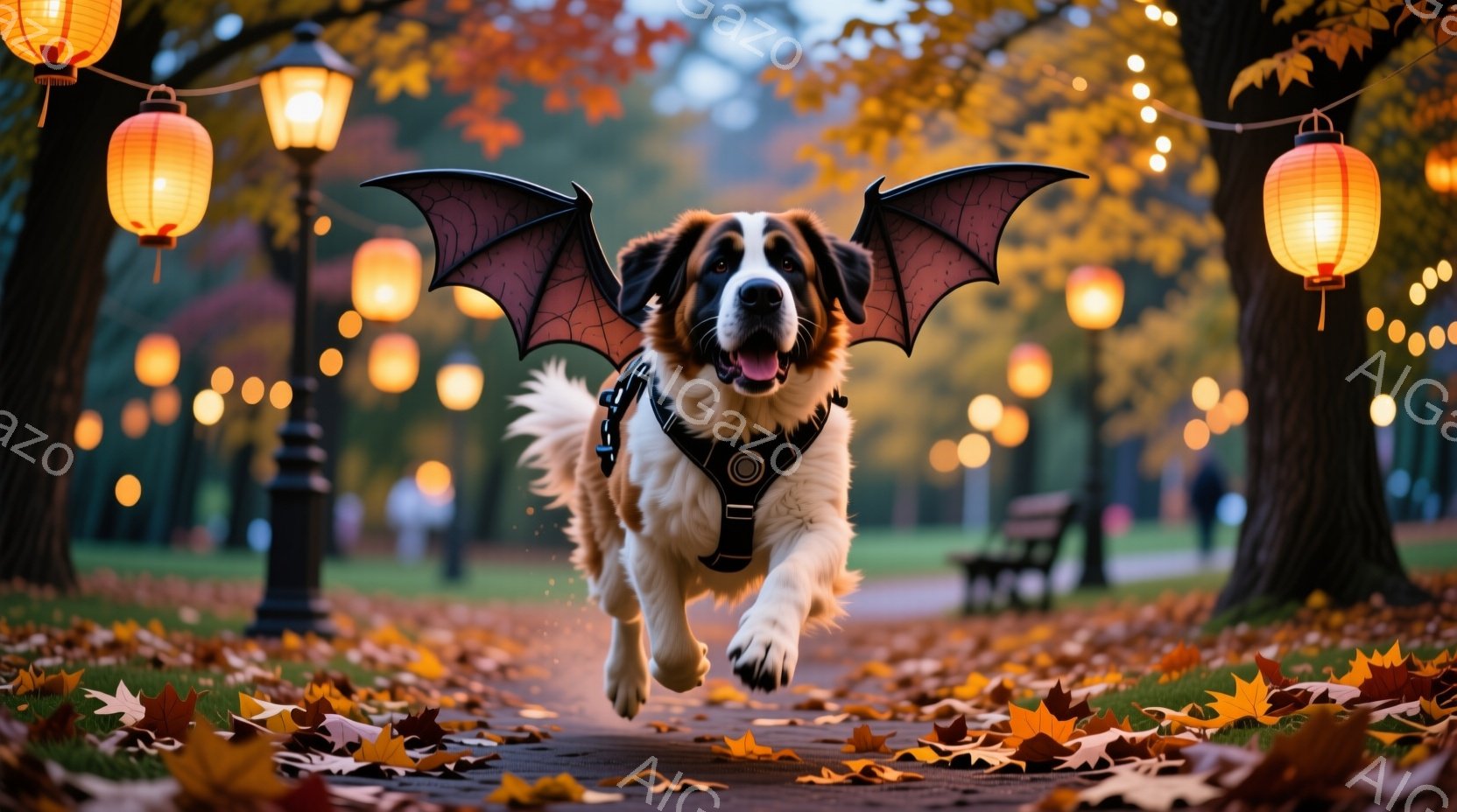 大きな犬が、翼が生えたように見えて、公園の小道の上を勢いよく走っている。背景には、落ち葉が敷き詰められた道、ベンチ、そしてオレンジ色の光を放つ提灯が並び、秋の暖かい雰囲気を感じさせる。犬は嬉しそうで、躍動感に満ちた姿が印象的だ。