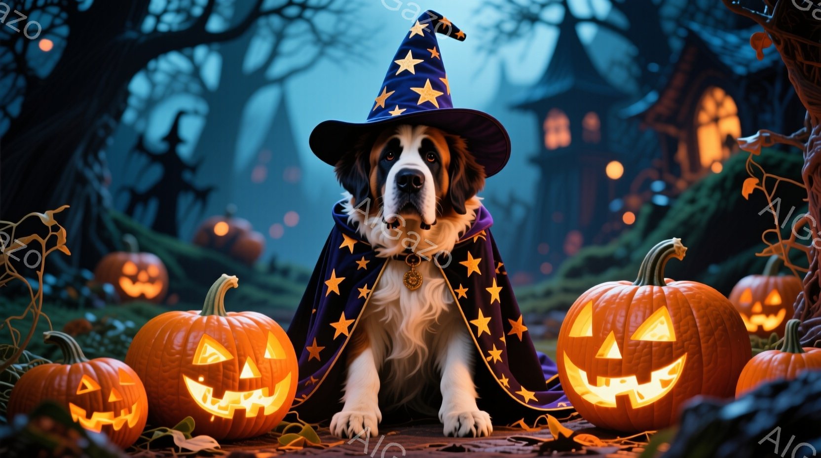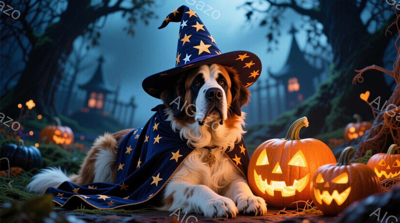 大きな白い犬が、星柄の青いマントと先のとがった黒い帽子を身につけて、ハロウィーンの雰囲気の中で横たわっています。周囲には様々な大きさのジャック・オ・ランタンが置かれ、薄暗い森の中、暖かい光を放っています。全体的に、趣のあるハロウィーンの夜を表現した、幻想的で魅力的な雰囲気です。