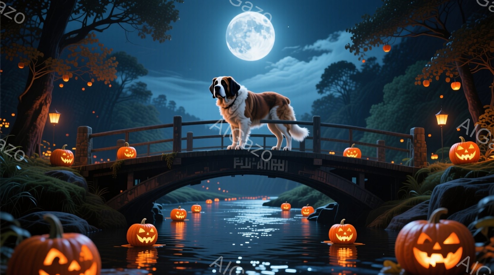 可愛らしい子犬がオレンジ色のパーカーを着て、照れくさそうにカメラ目線をしている。背景には、ジャック・オ・ランタンがいくつか並び、薄暗く不気味なハロウィンの夜を連想させる。全体的に暖かく、遊び心溢れる雰囲気で、秋の季節感とハロウィンの楽しさが感じられる。