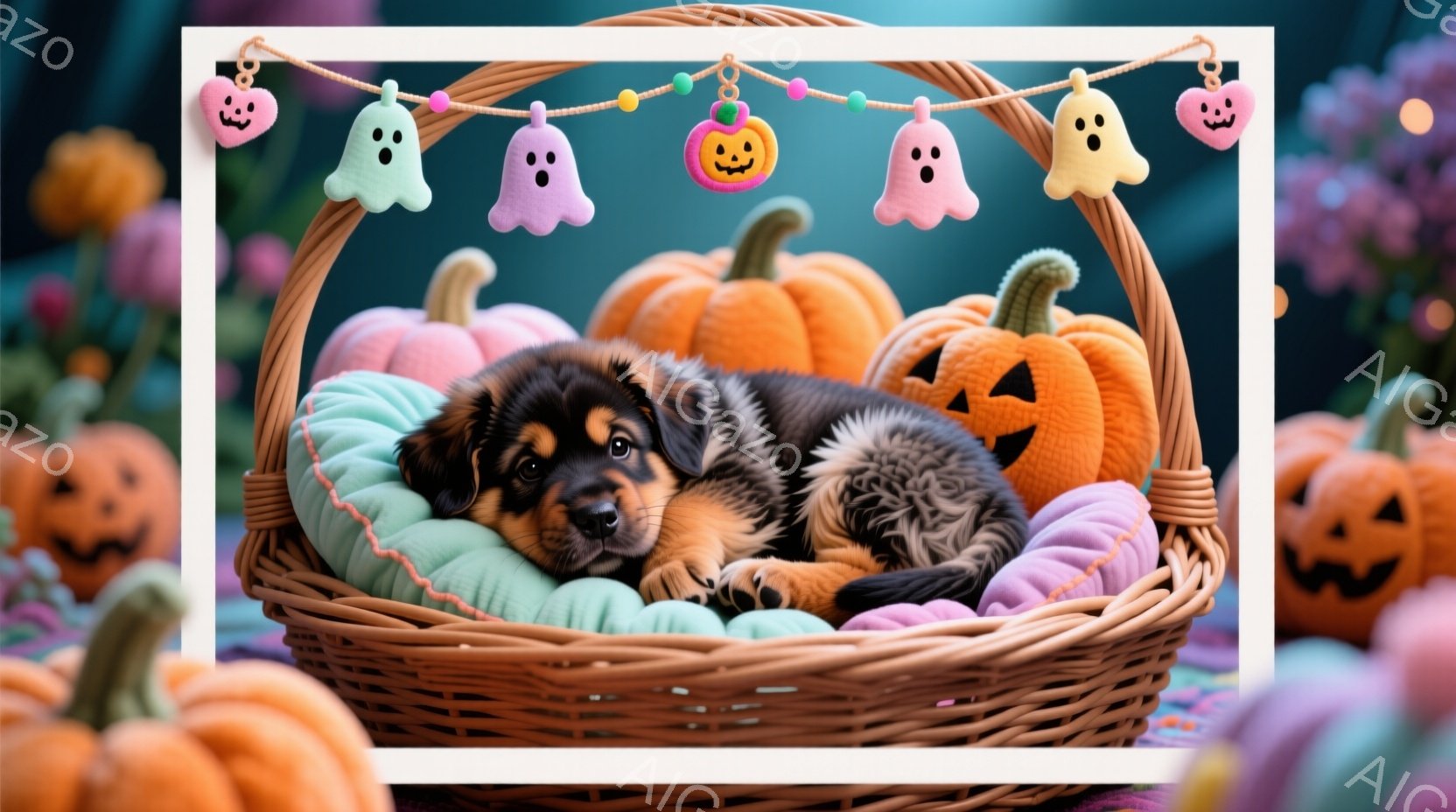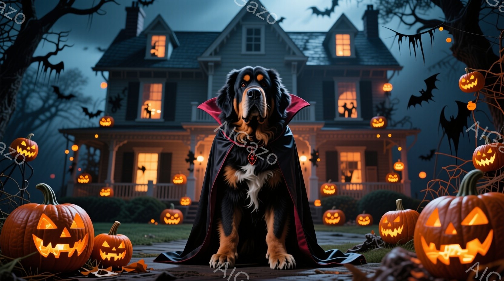 黒と茶色の毛並みを持つ大型犬が、ハロウィーンを彷彿とさせる黒いマントと赤い襟巻を身に着けて座っています。背景には、ジャック・オー・ランタンで飾られた庭と、不気味な雰囲気の古い屋敷が広がっています。夜空にはコウモリが舞い、全体的にハロウィーンの夜の幻想的な雰囲気を醸し出しています。