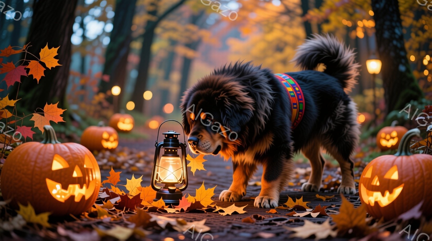 長い毛並みを持つ大きな犬が、落ち葉が敷き詰められた森の小道を歩いている。犬はカラフルな首輪を付けており、前方を少し見つめるような姿勢で、道の脇に置かれたジャック・オー・ランタンと灯籠の周りを照らす暖かい光が秋の雰囲気を高めている。背景は鮮やかな紅葉の木々で、暖かく幻想的なハロウィーンの情景が描かれている。
