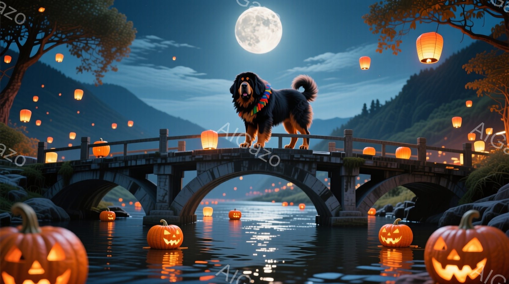 満月の夜、石造りの橋の上に大きな黒い犬が立っている。橋の両側には、微笑むカボチャのランタンが並び、水面にはその光が反射している。背景には緑豊かな山々がそびえ立ち、幻想的な雰囲気を醸し出している。