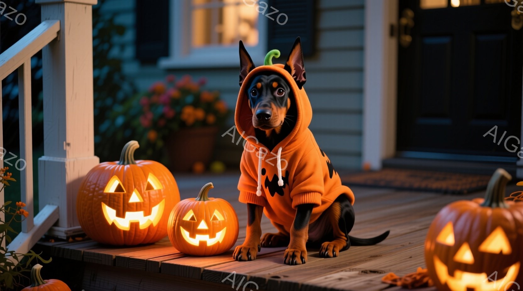 黒い毛並みの犬がハロウィーンをテーマにしたオレンジ色のパーカーを着て、正面をまっすぐ見て座っています。犬の周りには、ジャック・オー・ランタンとして彫られた、点灯しているオレンジ色のカボチャが配置されており、木製のデッキの上に並んでいます。背景にはぼんやりと見える家と、秋らしいオレンジ色の花が咲き乱れ、温かくお祝いムードに満ちた夜の雰囲気です。