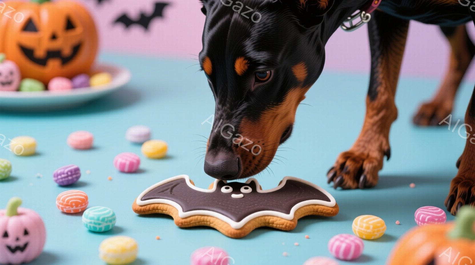 チョコレート色の毛並みのダックスフンドが、ハロウィーンをテーマにしたクッキー(コウモリの形)を鼻でそっとつついています。背景には、カラフルなマカロンや、可愛らしい表情のハロウィーンパンプキンが散りばめられており、明るいピンクと水色のグラデーションが目に鮮やかです。全体的に、ハロウィーンの楽しさと、愛らしい犬の様子が伝わる、温かくて遊び心のある雰囲気です。