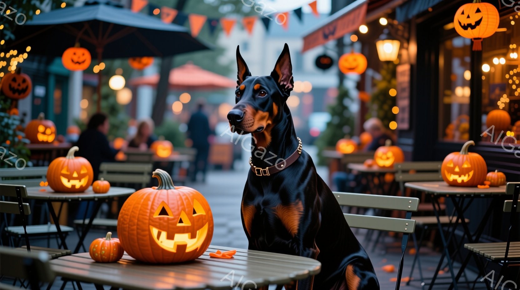 ドーベルマンが、ハロウィンの飾り付けがされた屋外カフェのテーブルに座っている。その犬は光沢のある黒い首輪をつけ、真剣な表情でこちらを見ている。背景には、かぼちゃのランタンやイルミネーションが飾られたカフェと、ぼんやりと見える人々がおり、秋の夜の温かくお祭り気分な雰囲気を醸し出している。