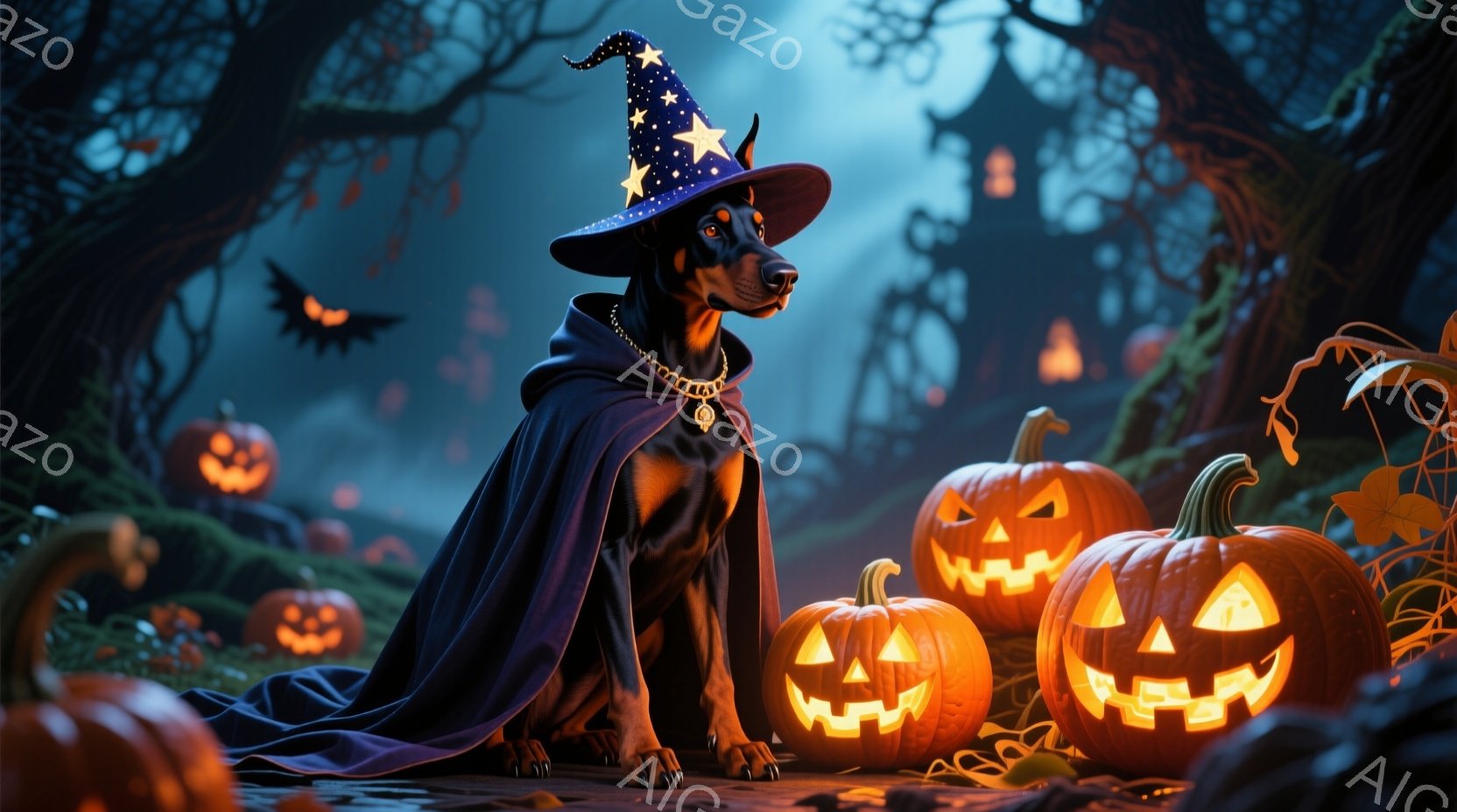 ドーベルマンが魔法使いの帽子と星が散りばめられたマントを着て、まっすぐに座っています。周囲には様々な大きさのジャック・オー・ランタンが配置され、背後には暗い森と遠くに見えるお城がぼんやりと見えます。全体的にハロウィーンの夜を思わせる、神秘的で少し不気味な雰囲気です。
