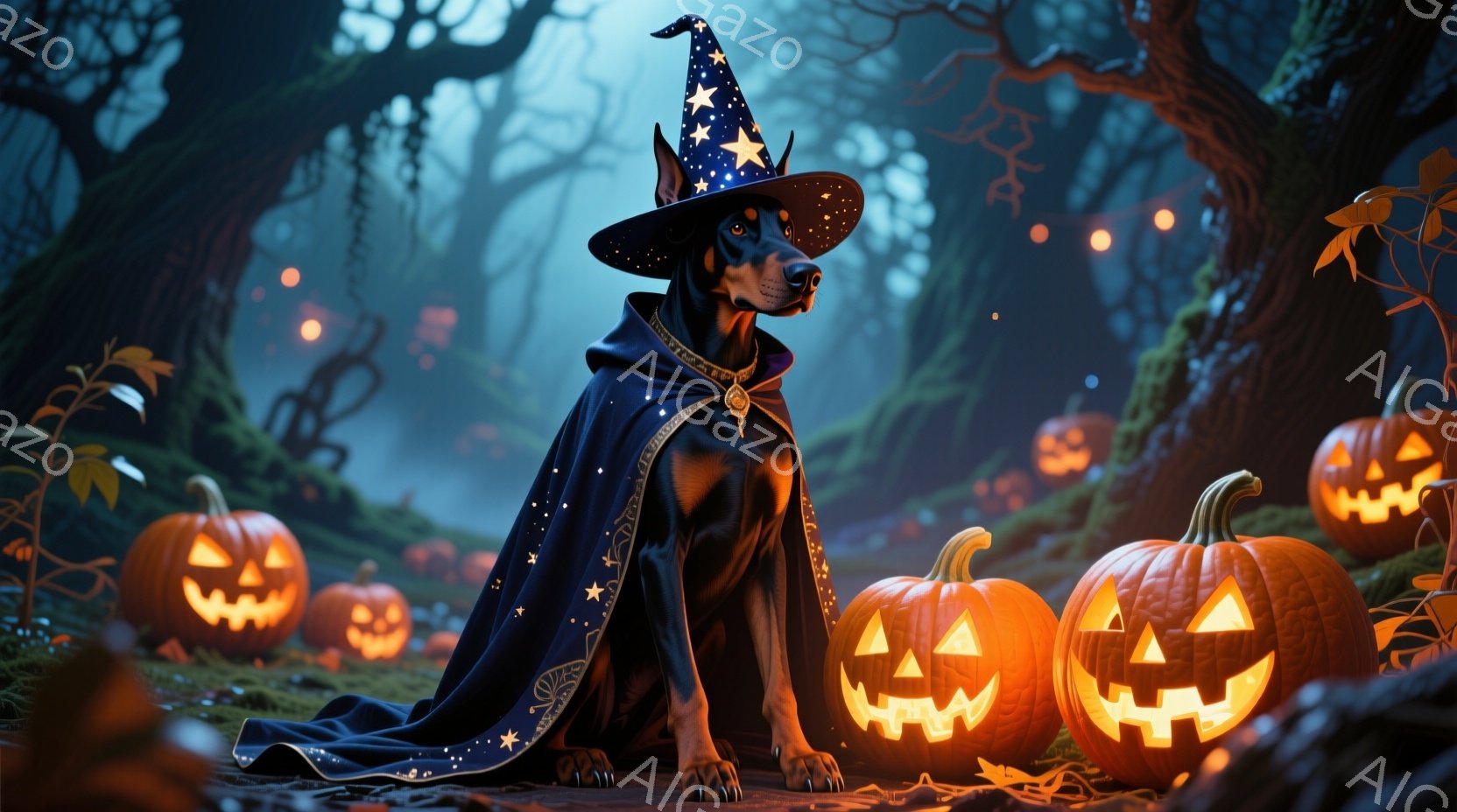 黒いドーベルマンが白いベッドに横たわっており、顔はリラックスした表情でカメラの方を見ている。背景にはハロウィーンを意識したカボチャ柄の枕や、カボチャの置物が置かれ、温かい光のガーランドが天井から吊るされている。全体的にハロウィーンの装飾が施された居心地の良いベッドルームで、穏やかでリラックスした雰囲気が漂っている。