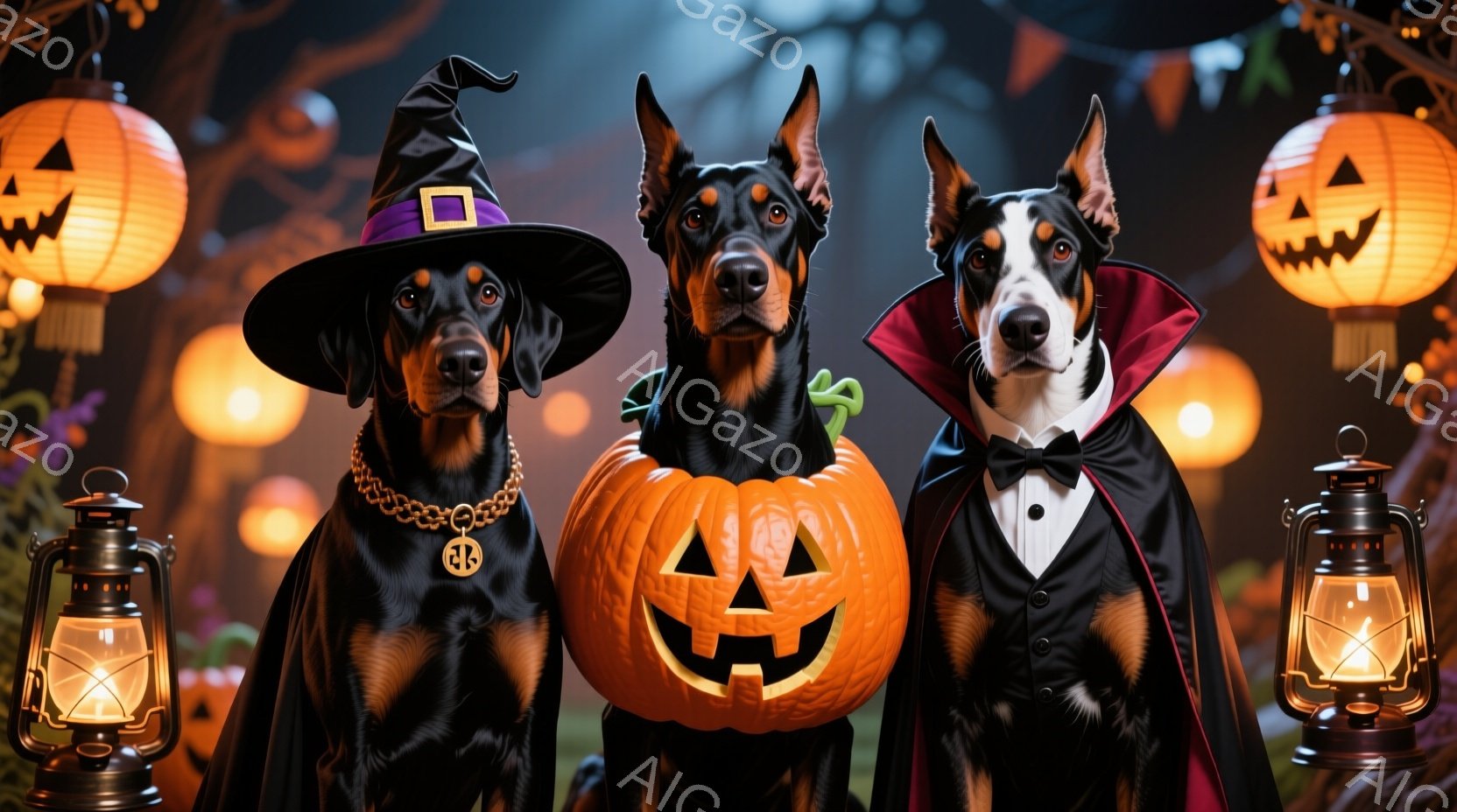 三匹の犬がハロウィーンの衣装を着ています。左の犬は魔女の帽子とオレンジのリボンで飾られ、真ん中の犬は紫色のドレスとネックレスを身につけ、カボチャを持っています。背景にはたくさんのジャック・オ・ランタンとランタンが飾られ、暗くてお祝いの雰囲気を作り出しています。
