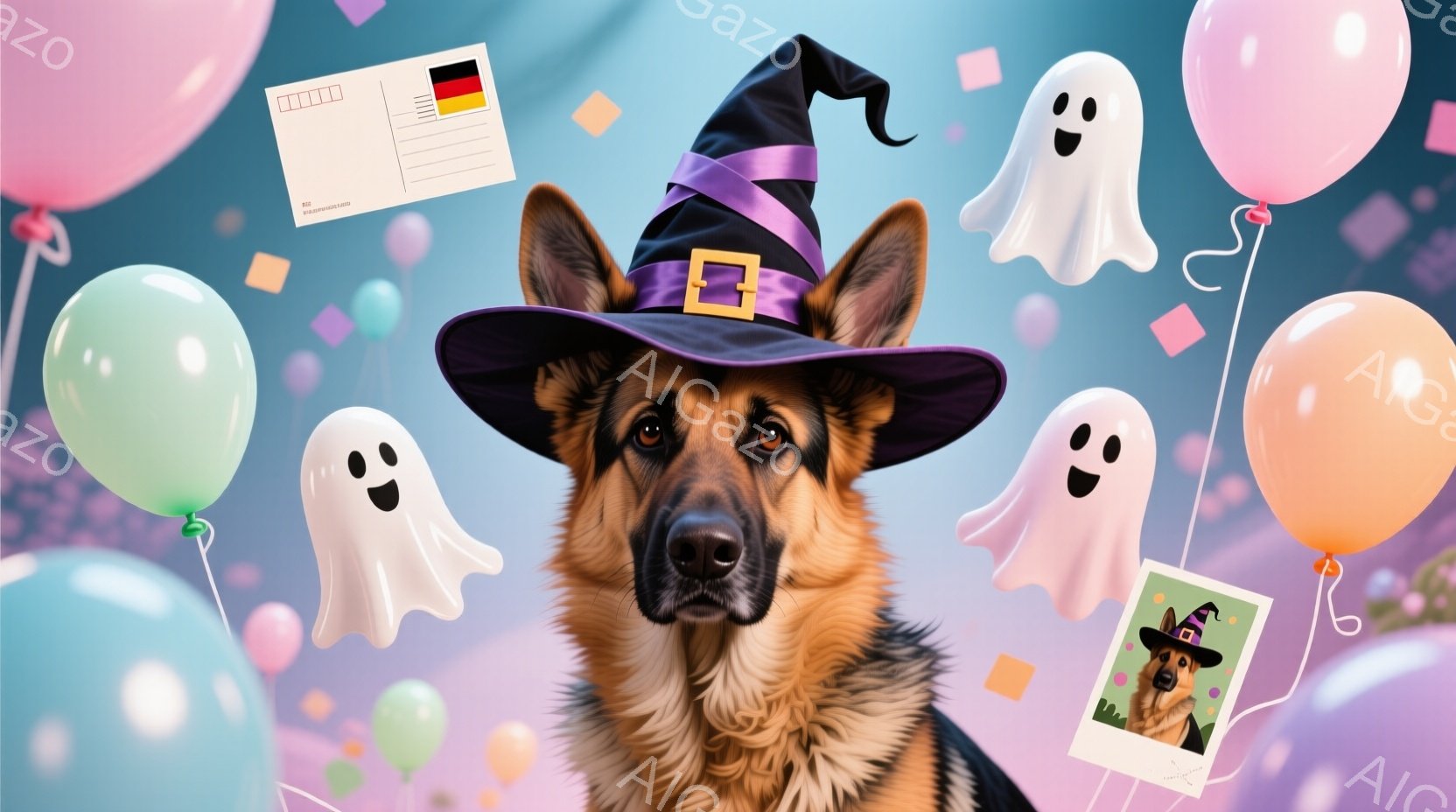 ハロウィーンをテーマにしたドイツシェパード犬のポートレートです。犬は黒い魔女帽子をかぶり、真剣な表情で正面を見つめています。背景には、紫とピンクの風船と幽霊のイラストが散りばめられ、お祝いの雰囲気を醸し出しています。
