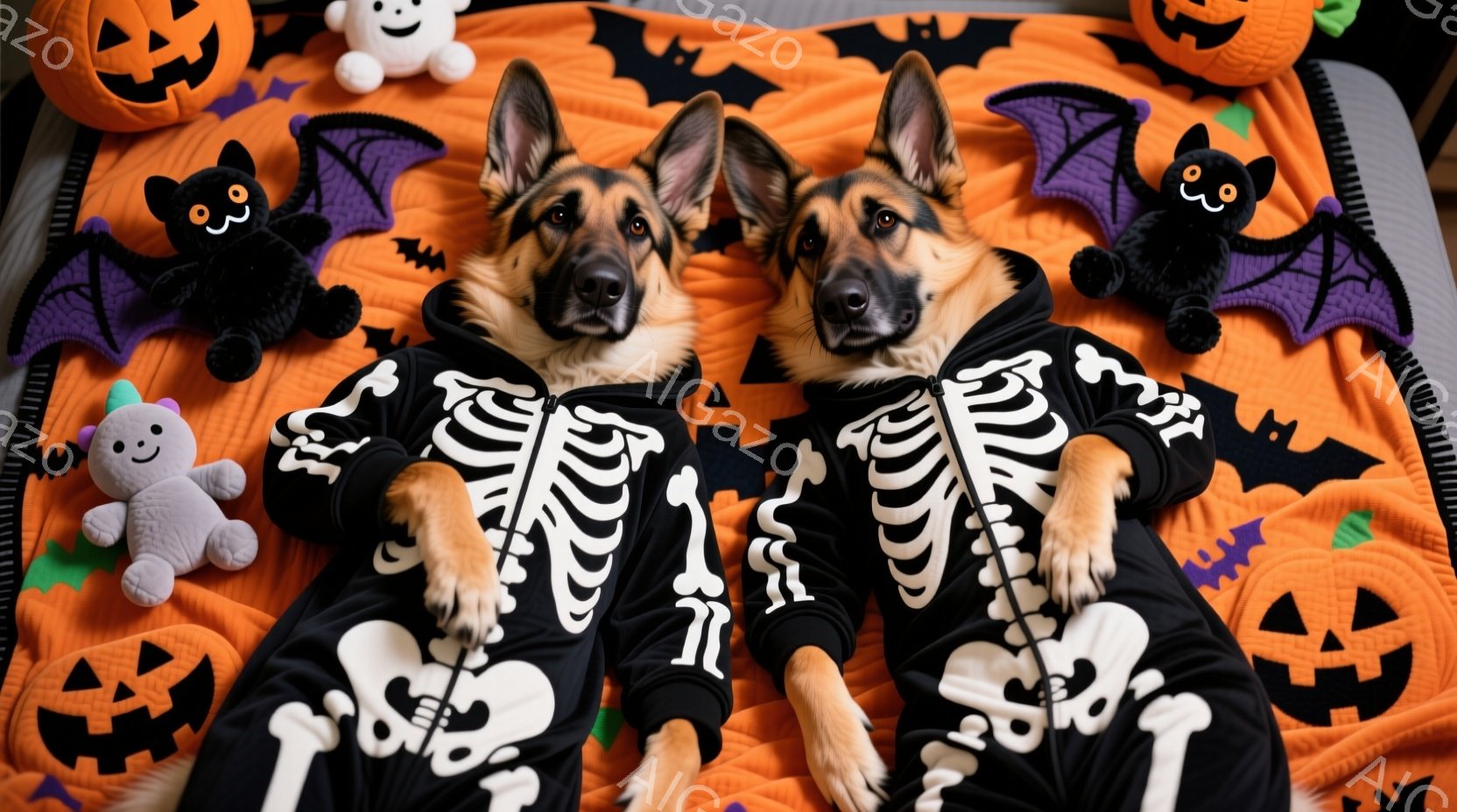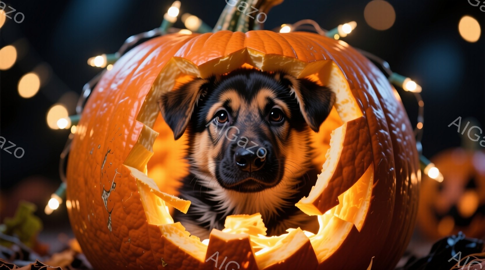 くり抜かれたカボチャの中に、小さなジャーマンシェパードの子犬が顔を出しています。子犬はまっすぐ前を見ており、好奇心と少しの戸惑いが混ざった表情をしています。背景は暗く、カボチャの周りにはぼんやりと光る電飾と落ち葉があり、ハロウィーンの雰囲気を感じさせます。