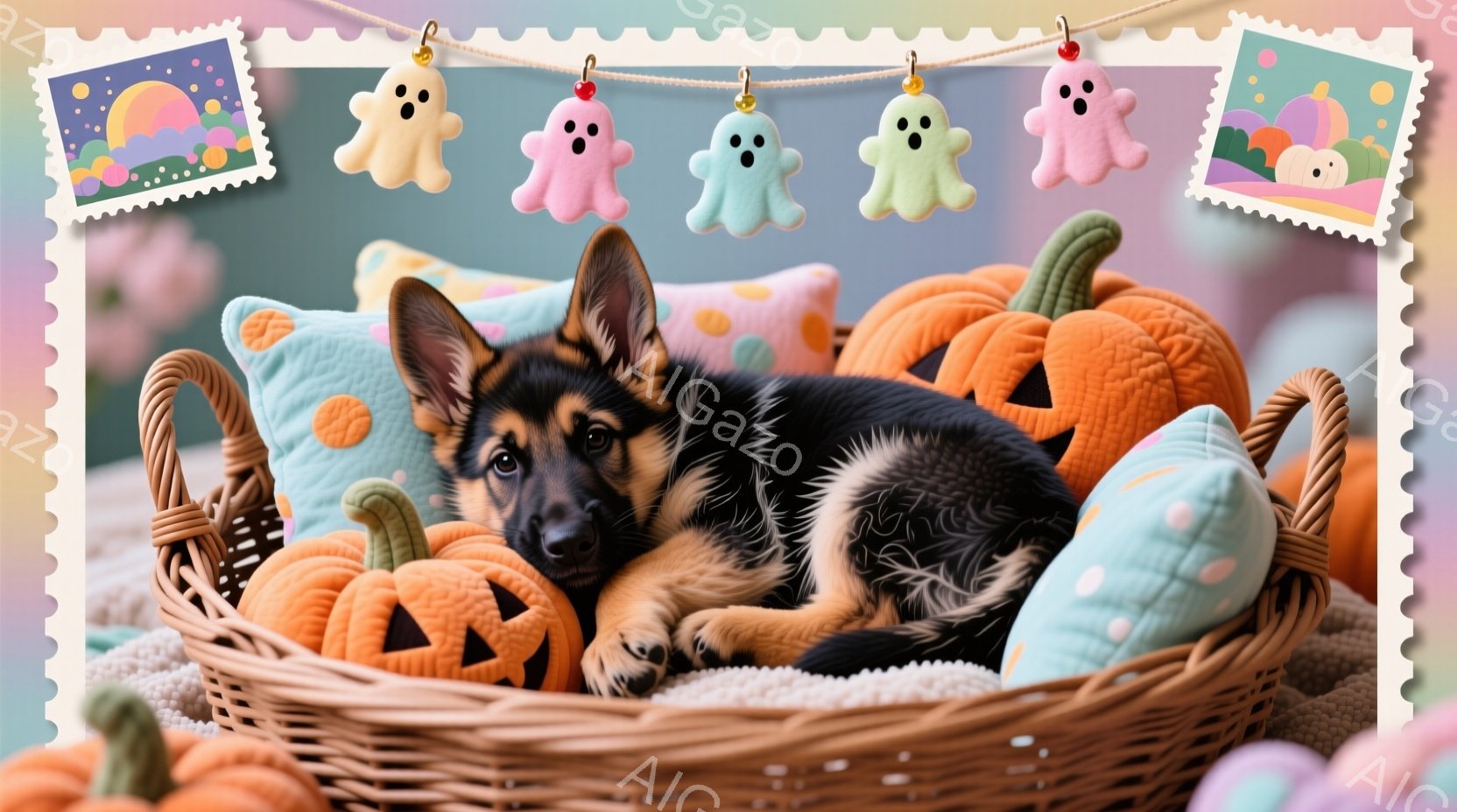 ドッグがハロウィーンをテーマにしたバスケットに包まれています。バスケットには、カボチャ、お化け、コウモリなどのハロウィーンの飾りと小さなカボチャが敷き詰められており、秋らしい雰囲気です。子犬はリラックスした様子で眠っており、全体的に暖かく可愛らしい印象を与えています。