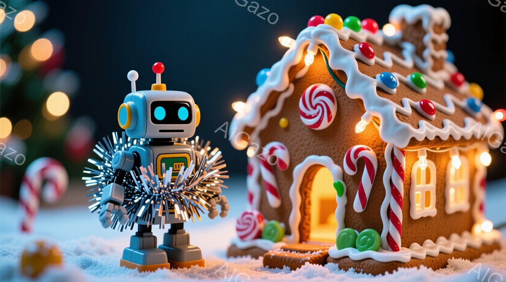 白いロボットが、きらびやかな銀色のポンポンを持って立っており、オレンジ色の足を持っています。背景には、ペパーミントキャンディやカラフルなキャンディで飾られた、可愛らしいジンジャーブレッドハウスがあり、雪景色の中にあります。温かく、お祝いのムードが漂う、クリスマスの雰囲気が感じられます。