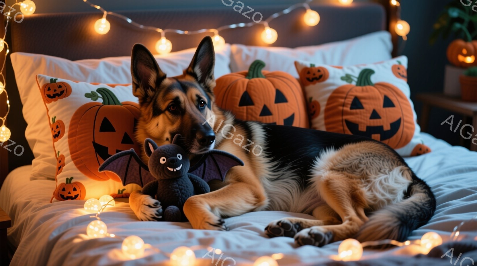魔女の帽子と星が散りばめられたマントを着たジャーマンシェパードが描かれています。犬は前足の間に彫刻されたハロウィーンのジャック・オー・ランタンに囲まれ、自信に満ちた表情で正面を見据えています。背景には、ぼんやりと光る家々や、秋の紅葉と霧に包まれた不気味な森が広がっており、ハロウィーンの夜の神秘的な雰囲気を醸し出しています。