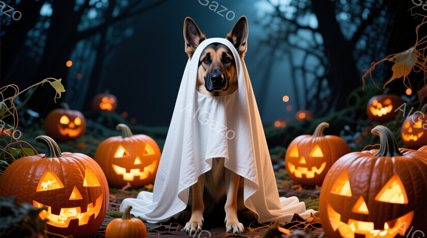 ハロウィーンの装飾が施されたベッドの上で、ジャーマンシェパードがリラックスして横たわっています。オレンジ色のカボチャ柄のクッションとコウモリのぬいぐるりに囲まれ、穏やかな表情でカメラを見ています。ベッド周りの温かい色のライトが、ハロウィーンの季節感を演出し、心地よい雰囲気を醸し出しています。