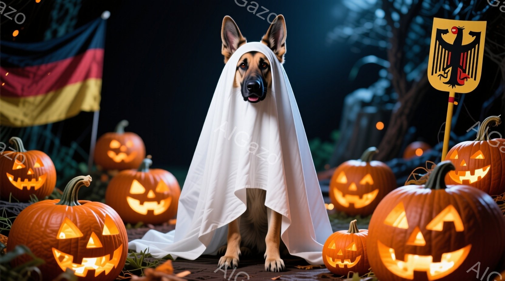 ハロウィーンをテーマにした写真で、ドイツシェパードが白い布を被って幽霊の仮装をしています。犬は正面をまっすぐ見ており、落ち着いた表情をしています。背景には、さまざまな大きさの彫刻が施されたカボチャが置かれ、暗い森の中で温かく光る様子が描かれ、お祝いムードを演出しています。