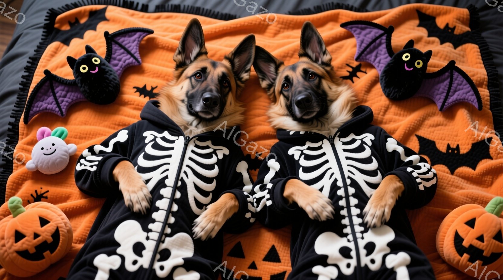 ハロウィーンをテーマにした画像で、ドイツシェパードが黒いマントを羽織って正面を向いています。背景には、たくさんのジャック・オー・ランタンで飾られた古い邸宅があり、夜空にはコウモリが舞っています。全体的に、少し不気味で幻想的な雰囲気が漂っています。