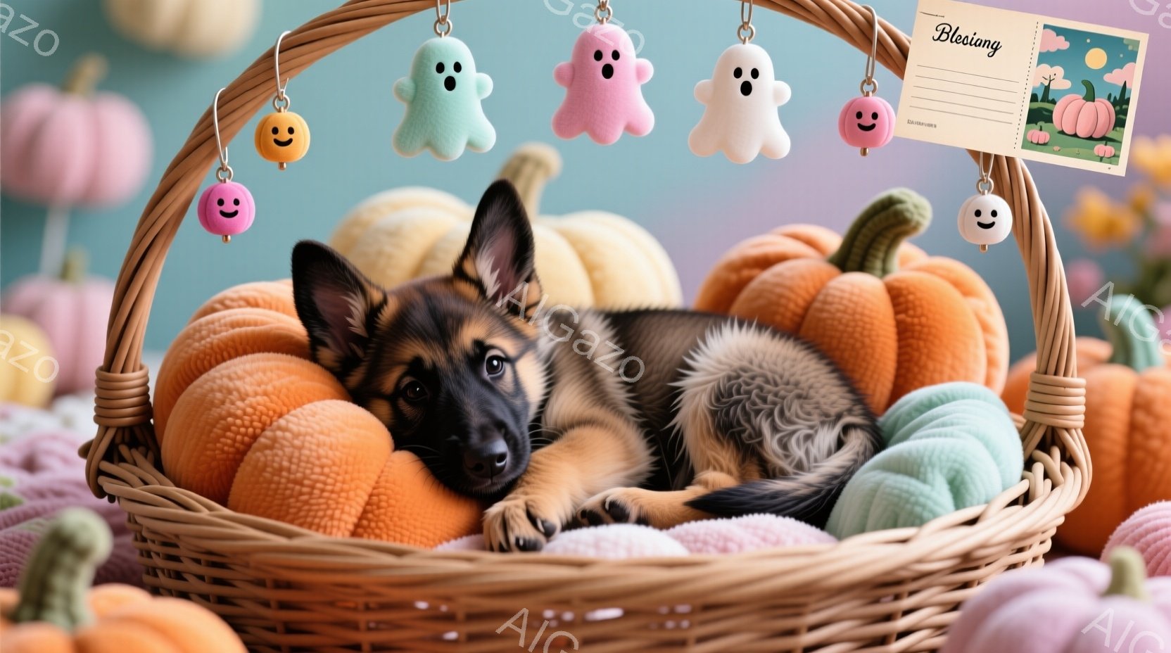 ハローウィーンをテーマにしたバスケットに、愛らしいジャーマンシェパードの子犬が丸まって眠っています。オレンジ色のカボチャのぬいぐるみ、白いゴーストのガーランド、ハロウィーンの装飾で囲まれており、温かく可愛らしい雰囲気を醸し出しています。背景には、ぼんやりとハロウィーンの装飾が見え、全体的に秋らしい、ほっこりとした印象を与えます。
