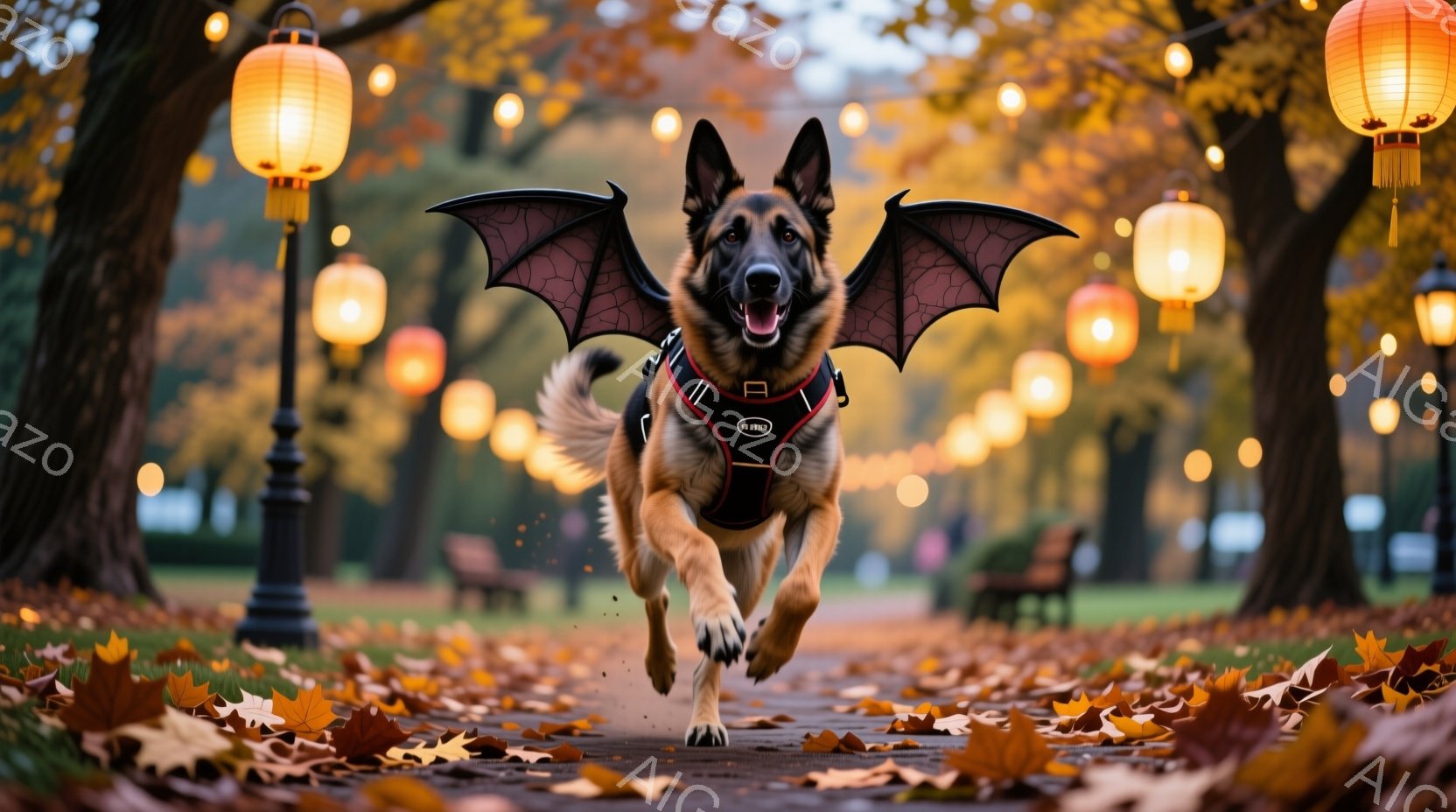 広大な公園の遊歩道を、翼をつけたジャーマンシェパードが疾走している。秋の黄葉が地面を覆い、背景にはぼんやりと街灯が並び、ハロウィーンのような幻想的な雰囲気を醸し出している。犬は楽しげに走り、その姿は生き生きとしており、秋の公園で自由を満喫している様子が伝わってくる。