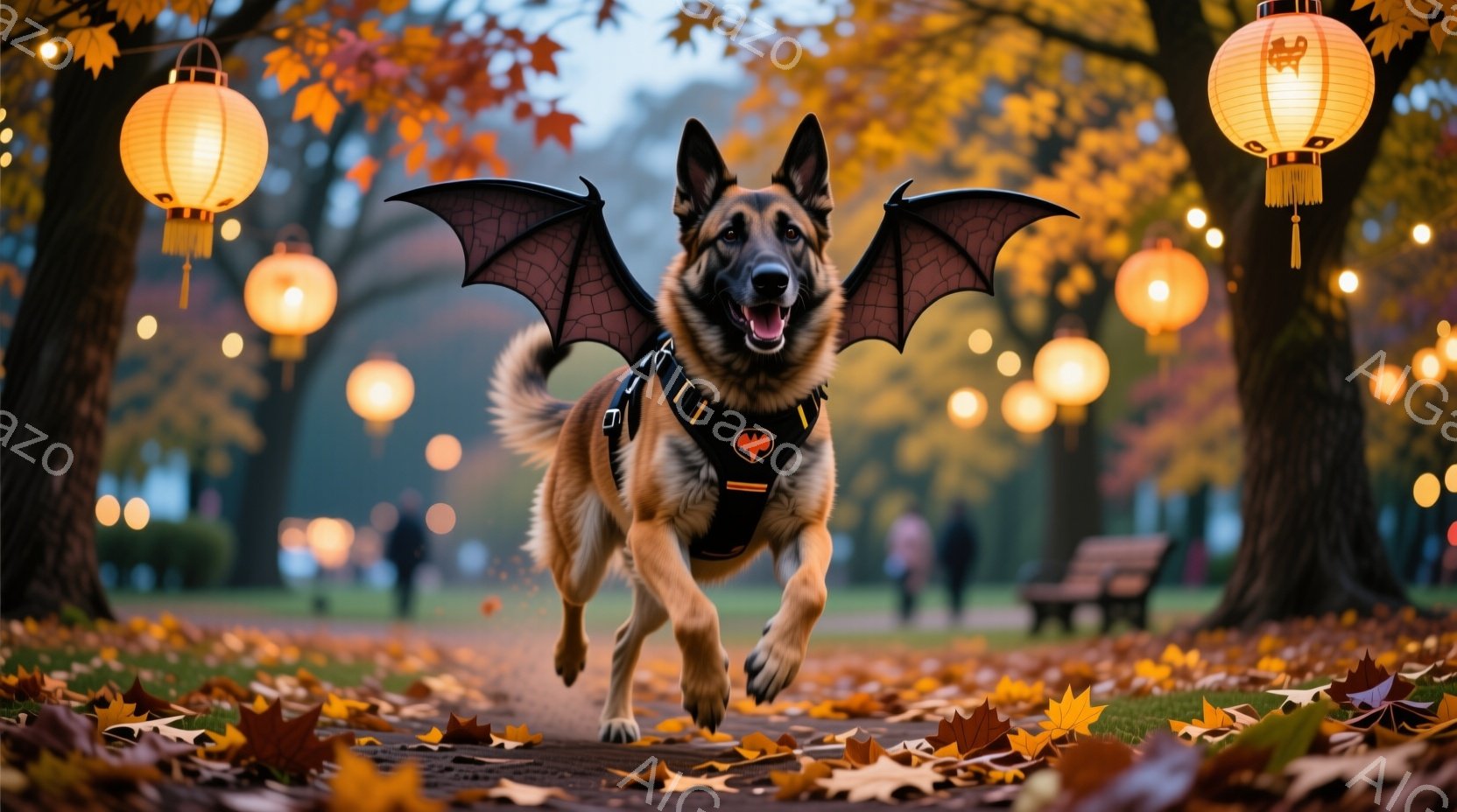 秋の公園を黒い翼を広げたジャーマンシェパードが勢いよく走り去る姿が写っている。地面には落ち葉が散らばり、背景にはぼやけた木々と街灯が並び、ハロウィンのような幻想的な雰囲気を醸し出している。犬はハーネスを着用し、嬉しそうに口を開けて走っており、躍動感に満ちた一枚である。