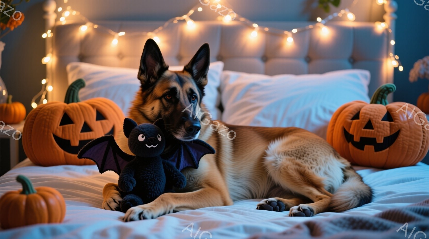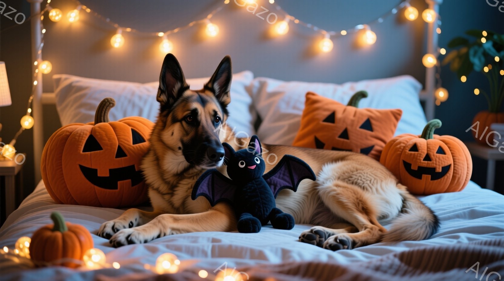 ハロウィーンの飾り付けがされたベッドの上に、ジャーマンシェパードが横たわっています。犬はリラックスした表情で、隣にはコウモリのぬいぐるりと、ジャック・オー・ランタンの置物が並んでいます。背景にはオレンジ色のイルミネーションが飾られ、全体的に暖かく、お祝いの雰囲気が漂っています。