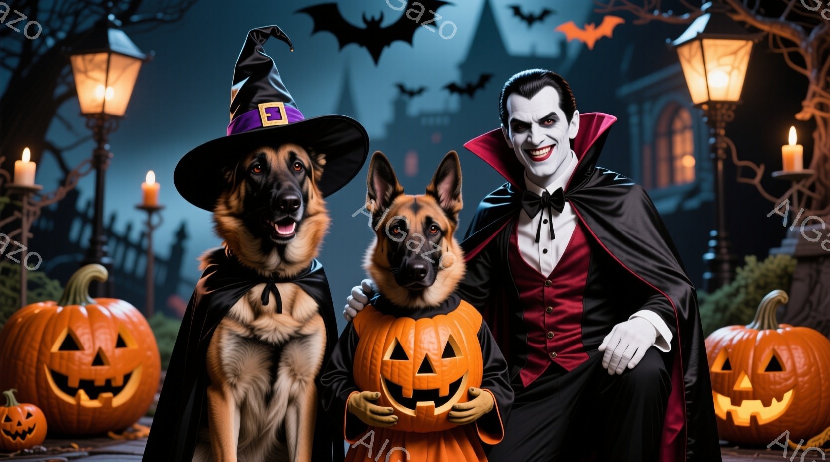ハロウィーンの夜を思わせる写真で、左からシェパード犬が魔女の帽子を被り、中央にはカボチャの衣装を着た少女、右にはドラキュラ風の衣装を着た男性が写っています。3人は少し微笑んでおり、背景にはジャック・オー・ランタンや不気味な屋敷がぼんやりと見え、ハロウィーンの雰囲気を盛り上げています。全体的に、楽しいハロウィーンの夜を表現した、明るく楽しい写真です。