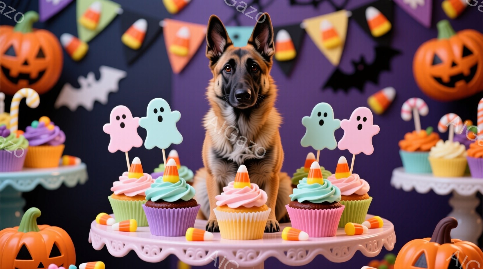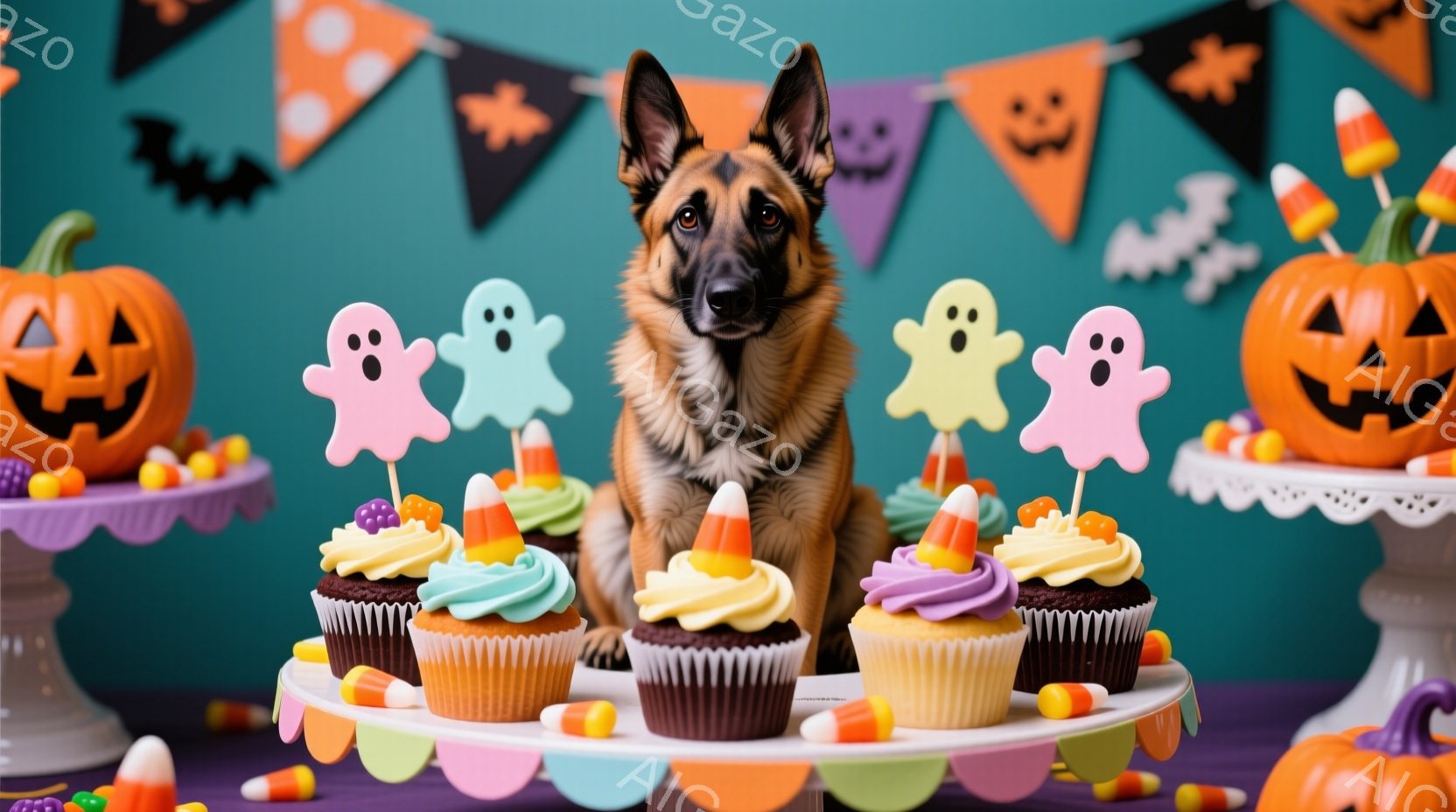 ハロウィーンをテーマにした画像で、中央にはドイツシェパードが座っています。周りにはオレンジ、紫、水色のクリームが飾られたカップケーキと、可愛らしいお化けの飾り、そしてキャンディコーンが並べられています。背景は紫色の壁で、ハロウィーンの飾り付けがされており、お祝いの雰囲気が漂っています。