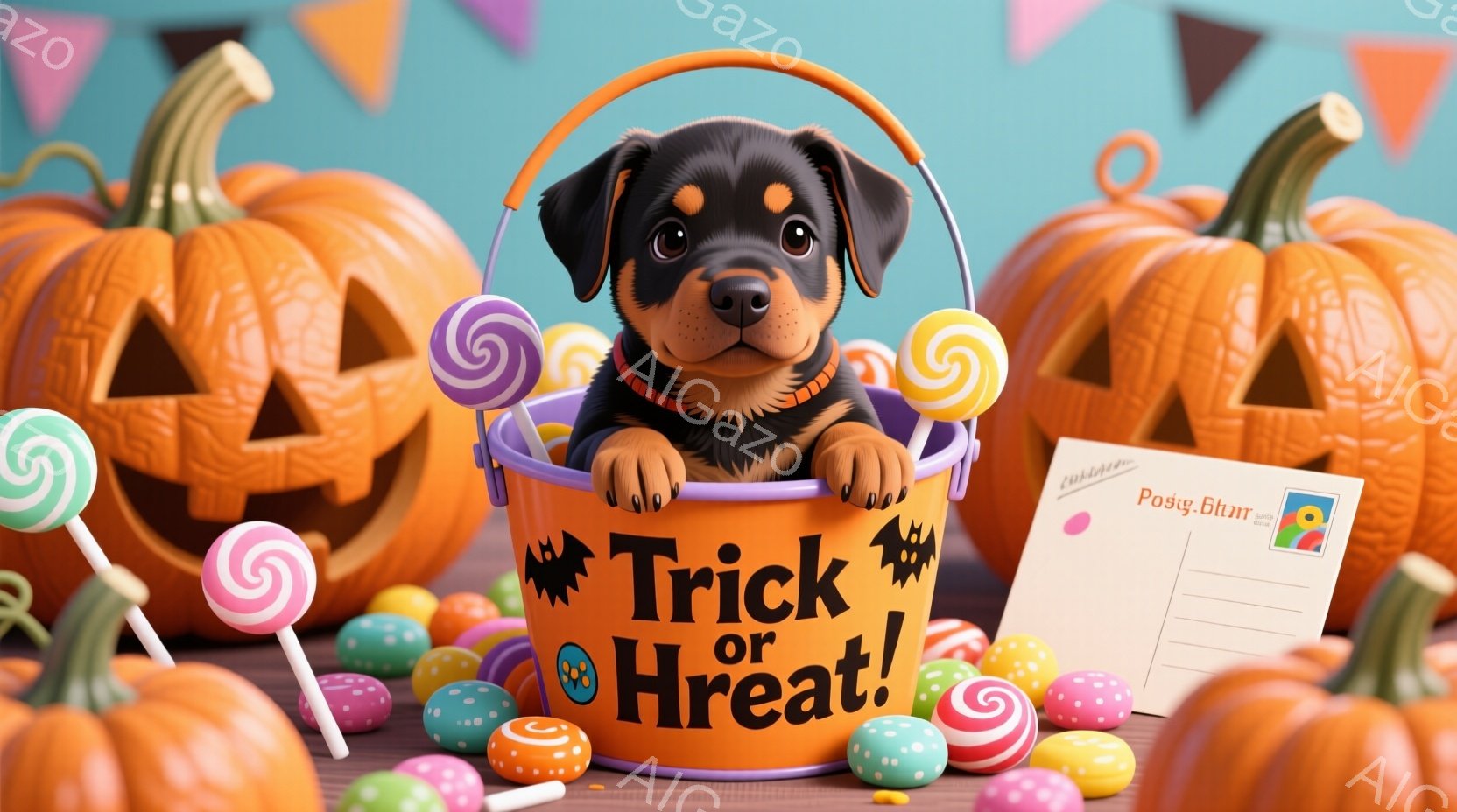 オレンジ色の背景に、ハロウィーンの飾りとカボチャが並んでいます。小さな黒い子犬が「Trick or Treat」と書かれたバスケットから顔を出し、可愛らしい表情をしています。カラフルなキャンディーがバスケットと背景に散りばめられ、お祝いムードを盛り上げています。