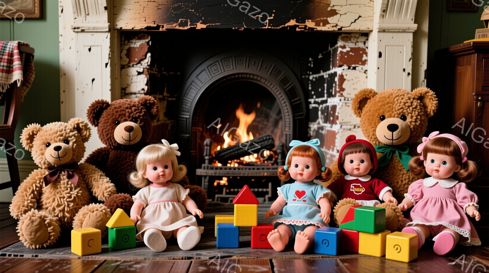 暖炉の前には、2体のテディベアと2体の人形が座っています。人形はそれぞれ白いワンピースを着ており、髪は茶色で、赤いハートの模様が入った服を着ています。暖炉の火が暖かく、部屋全体を照らし、おもちゃの積み木が散らばるレトロな雰囲気の室内です。